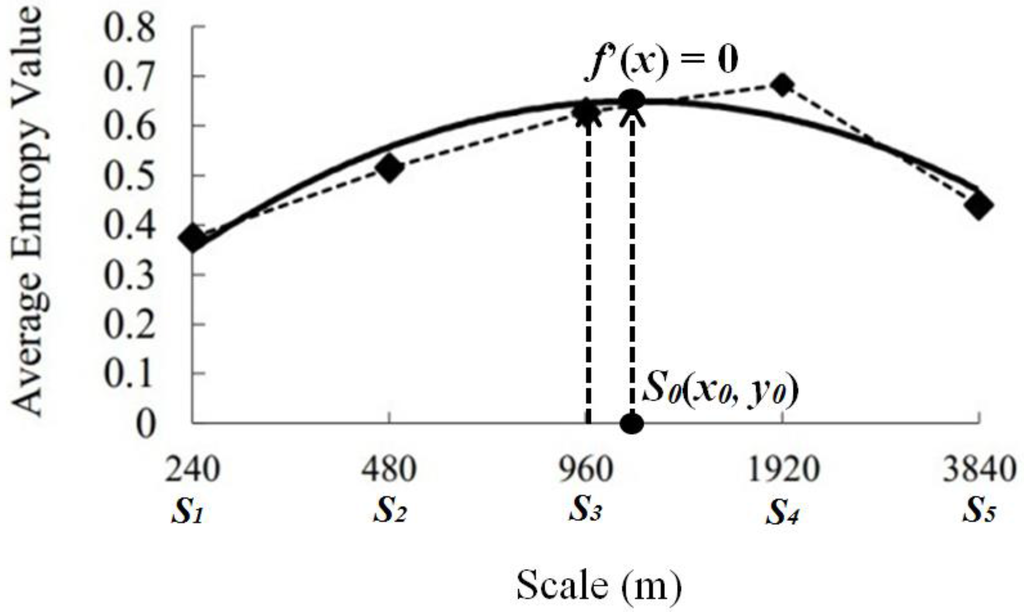 Figure 3 shows the response of the average entropy value to different scales. From scale 240 m to 1920 m, the average value increases as the cell size becomes longer, while from 1920 m to 3840 m, it starts to decrease. According to Equations (2) and (3), S3 (960 m) is the scale that is most adjacent to stationary point S0, which was obtained when f’(x) = 0. Therefore, 960 m was chosen as the optimal scale to calculate the information entropy. The change of entropy value is most stable at this stationary point.