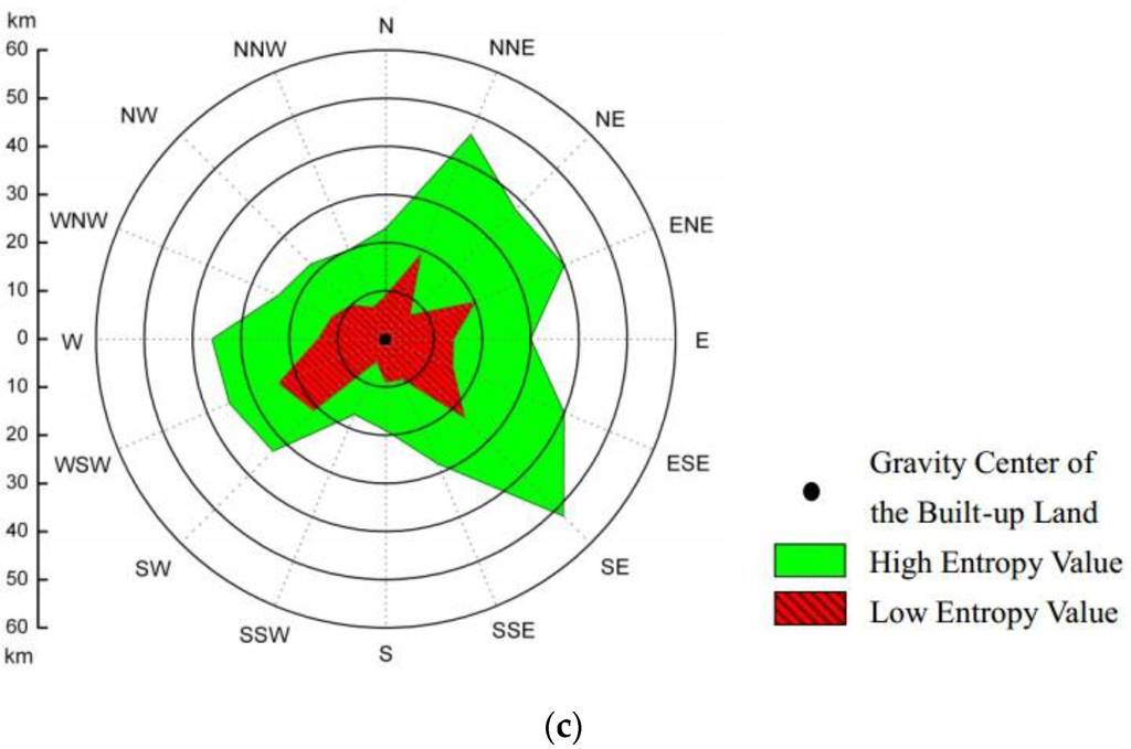 As in Figure 5c, the polar graph represents an area of a 60 km radius, which radiates from the centroid of the build-up land of the study area. The green part is the high information entropy value area while the red part is low. As a complement of the latitude and longitude direction recognition, it simulates the urban sprawl and delivers a result with a complete boundary of urban fringe. However, it has over generalized the urban morphology as there are several sub-cores situated in the surrounding metropolitan area.