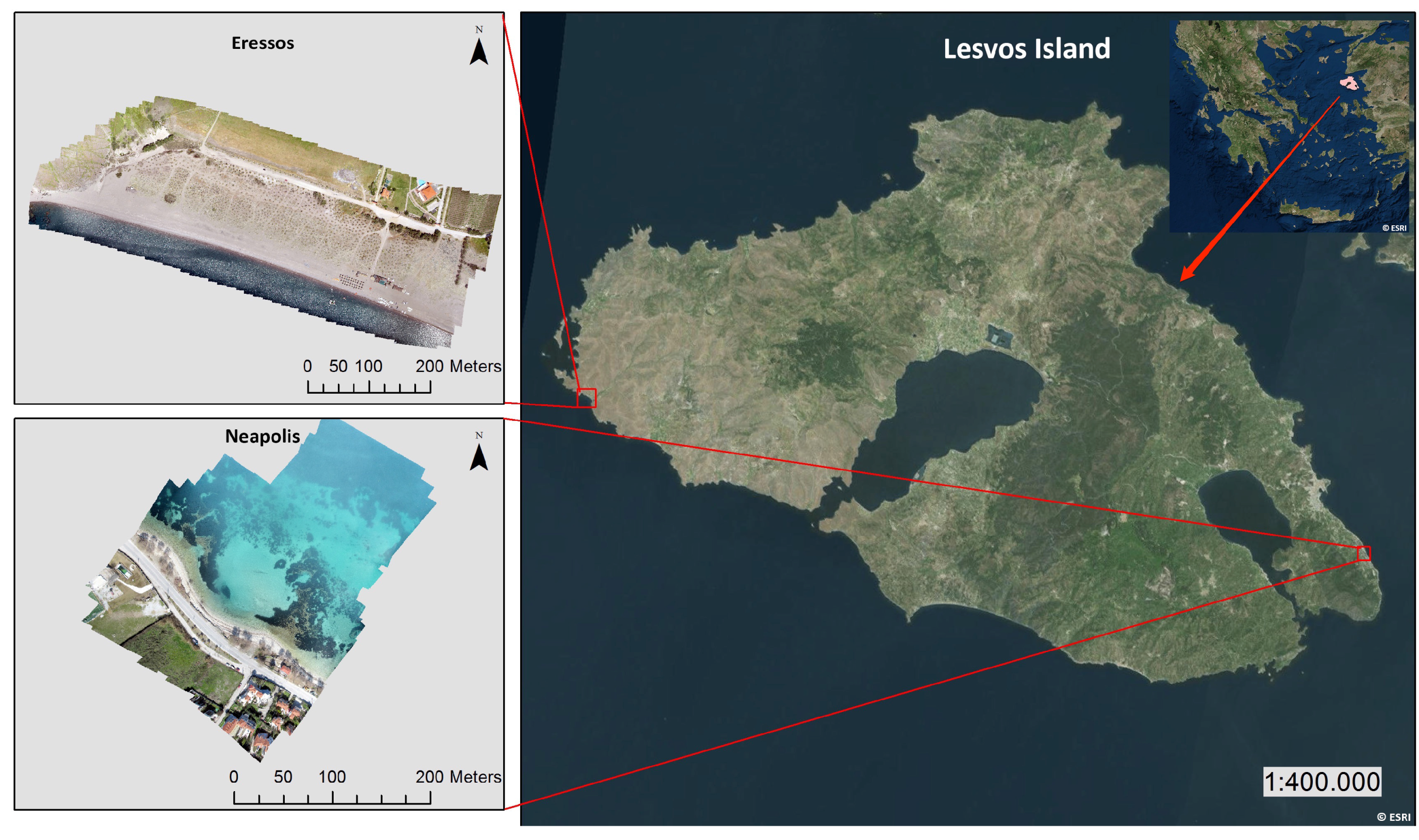 Two case study areas were selected in Lesvos Island, Greece; Eressos beach in the southeast and Neapoli beach in the (Figure 2). The sites presented significantly different coastline characteristics, but both are affected by erosion. Eressos beach is a large sandy beach approximately 4 km long that is affected by large north waves. It has a typical profile with a swash zone, a beach face, and a large bern with sand dunes. The southern part of Eressos beach is decreasing in width due to winter storms. In the last decade, the southern part of the beach has lost more than 10 m in width. Neapoli beach is a narrow beach next to a main road network that consists of a mixture of sand and gravel; it also contains dead algae that form a certain line in several areas along the coastline. This beach also contains trees (Tamarix) that help prevent erosion, although they are extremely close to the sea and influence the beach zone recognition. Due to strong north winds during the winter, Neapoli beach is affected by erosion that is represented by the shadows in the orthophoto maps.