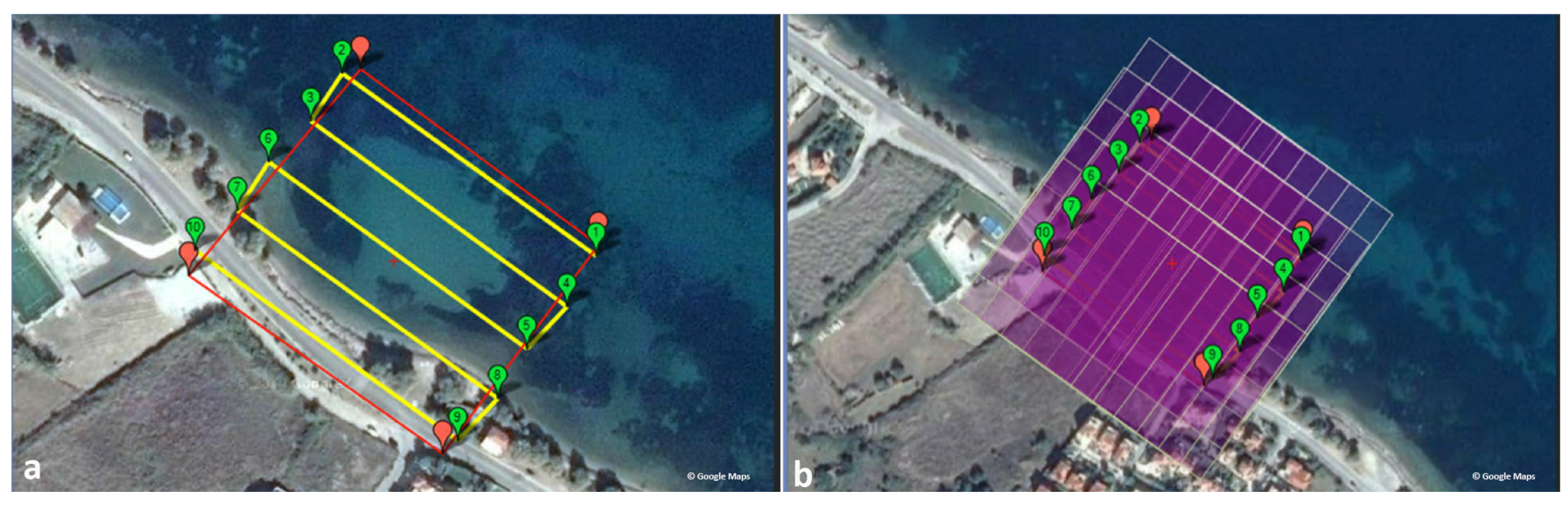 (a) Neapoli beach showing the UAV survey lines. The green pointers depict the route followed by the unmanned aerial systems (UAS) (order in-track) and the red pointers depict the four corners of the study area (mission block) (b) The overlap in-track and cross-track sidelap for image acquisition. The purple color depicts the acquired image footprint. (Map data: Google, DigitalGlobe).