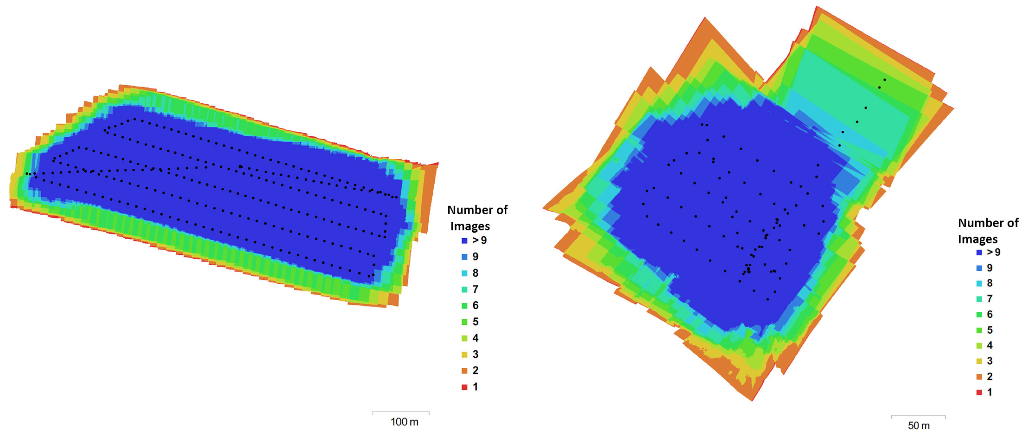 The camera locations and image overlaps for Eressos beach (left) and Neapoli beach (right). The legend colors depict the number of images that appear for every point.