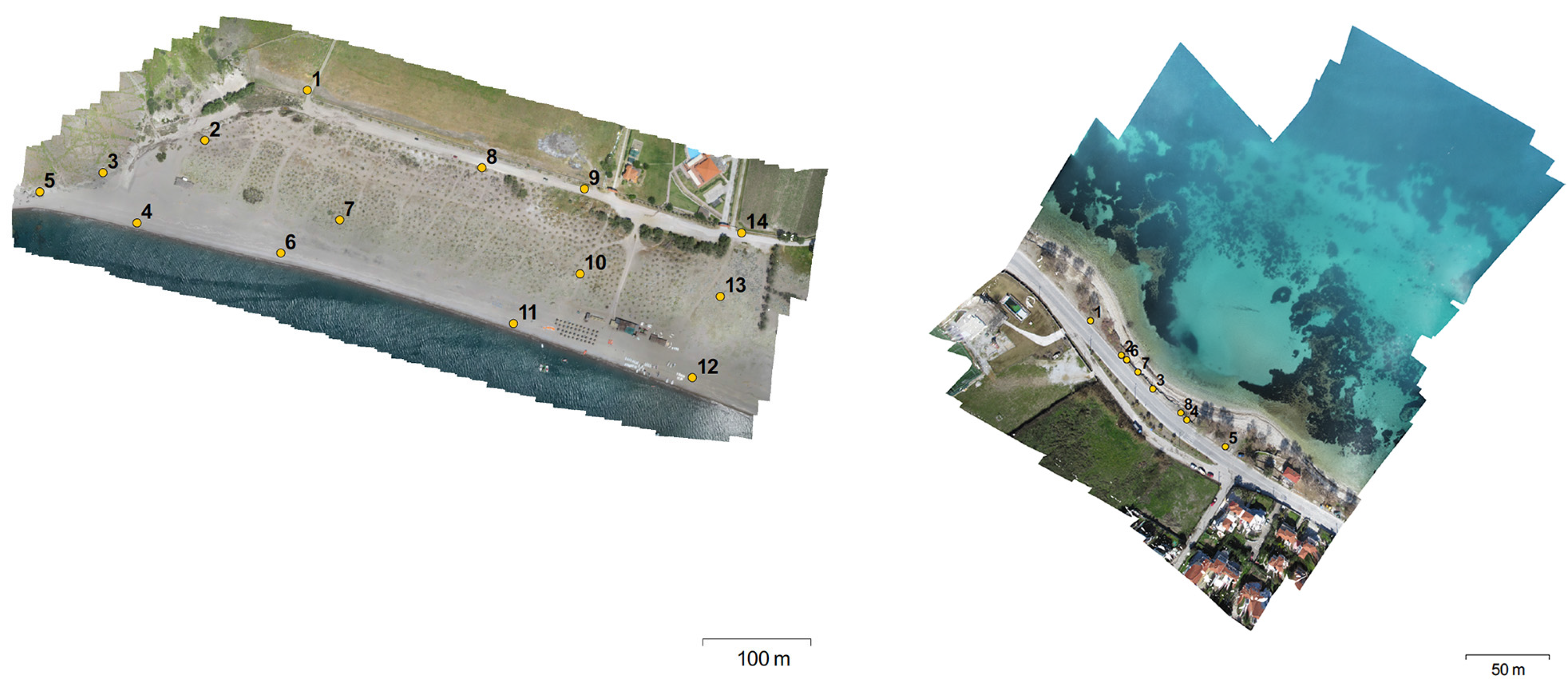 The ground control points (GCP) distribution for Eressos beach (left) and Neapoli beach (right).