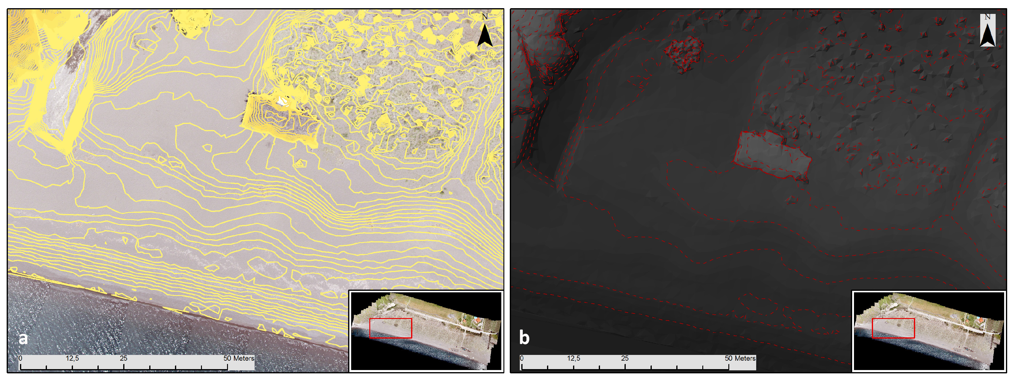 (a) The Eressos study site orthophoto showing the contour isolines of 10 cm (left); (b) The DSM and the berm zone with contour isolines of 1 m (right).