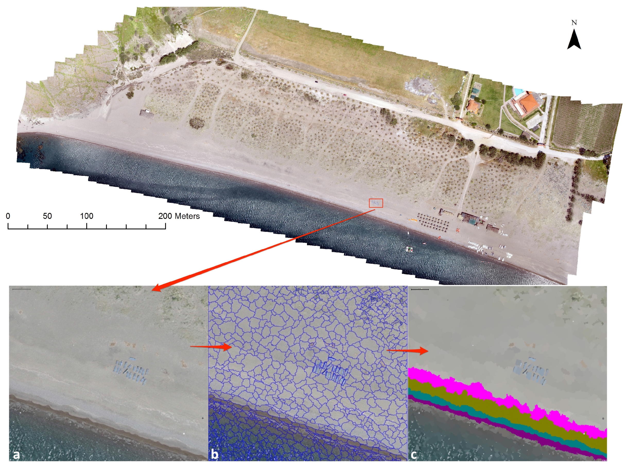 The first case study, Eressos beach, is a large sandy beach affected by large north waves. Figure 9 shows an example of the developed methodology used for a small portion of the beach. Using the image, objects could be classified into four zones according to their spectral characteristics. The most seaward zone is the swash zone where the wave runup makes the sand wet and, therefore, easily distinguishable from the rest of the zones. The next three zones belong to the beach face, although each one has different characteristics. The green zone represents an old swash zone (perhaps from the previous day) or an extreme wave runup due to large waves. The brown zone is a result of large waves from the previous days/weeks and consists of small pebbles and dead shells. The last purple zone of the beach face consists only of sand, and it is the result of large waves during winter. Several other zones are visible up to the northern part of the beach where the berm area and the sand dunes begin.