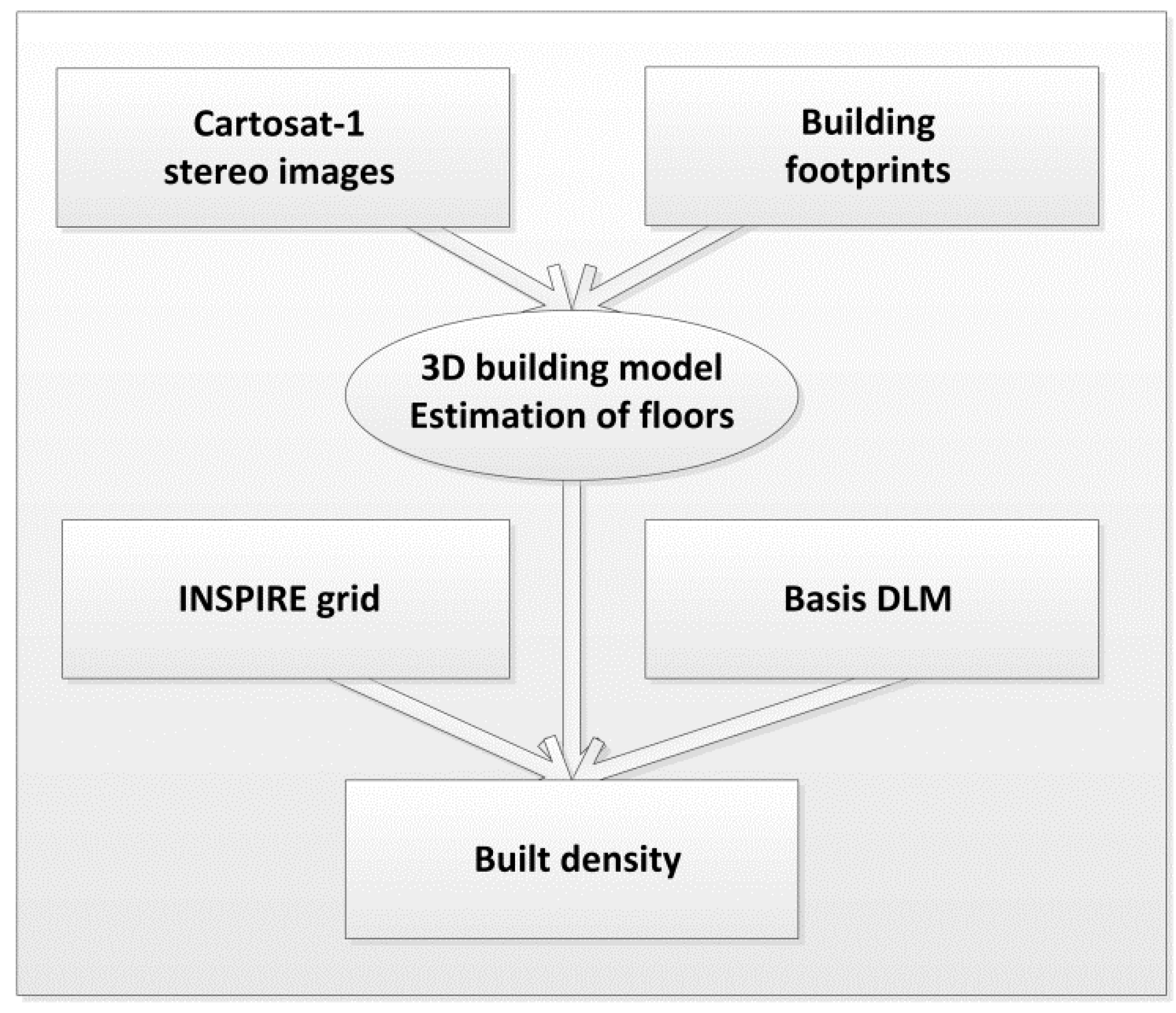 To overcome the restrictions in terms of imaged area and degree of detail, in the current analysis, we used stereo images acquired by the Indian Remote Sensing Satellite (IRS), which employs the Cartosat-1 stereo sensor on board. This sensor (IRS-P5) has the advantage that images are almost constantly acquired all over the world, as it was specifically designed for large-scale and large-area stereo mapping and the generation of digital surface models (DSM). The acquired stereo images cover a swath of 27 km and at a pixel spacing of 2.5 m, which can be exploited to generate DSMs with 5-m spacing [51,52]. Since the launch of Cartosat-1 in May 2005, large parts of the Earth have been mapped, including a coverage of Europe. In light of these characteristics, Cartosat-1 meets both the spatial and the geometric requirements for an area-wide and cost-effective derivation of height information from various large urban regions. The geometric accuracy of Cartosat-1 height measurements in the context of urban analysis at the spatial level of individual buildings has been analyzed in a few studies and demonstrated to be between a 3- and a 3.5-m standard deviation [47,53]. For an overview of the steps performed in modelling built density, please refer to Figure 1. This figure summarizes the steps performed in building modelling using Cartosat-1 stereo images and building footprints for the generation of 3D building models and ancillary data, such as INSPIRE (Infrastructure for Spatial Information in the European Community) grid geometries and land use data from the Basis DLM, to derive the desired built density.