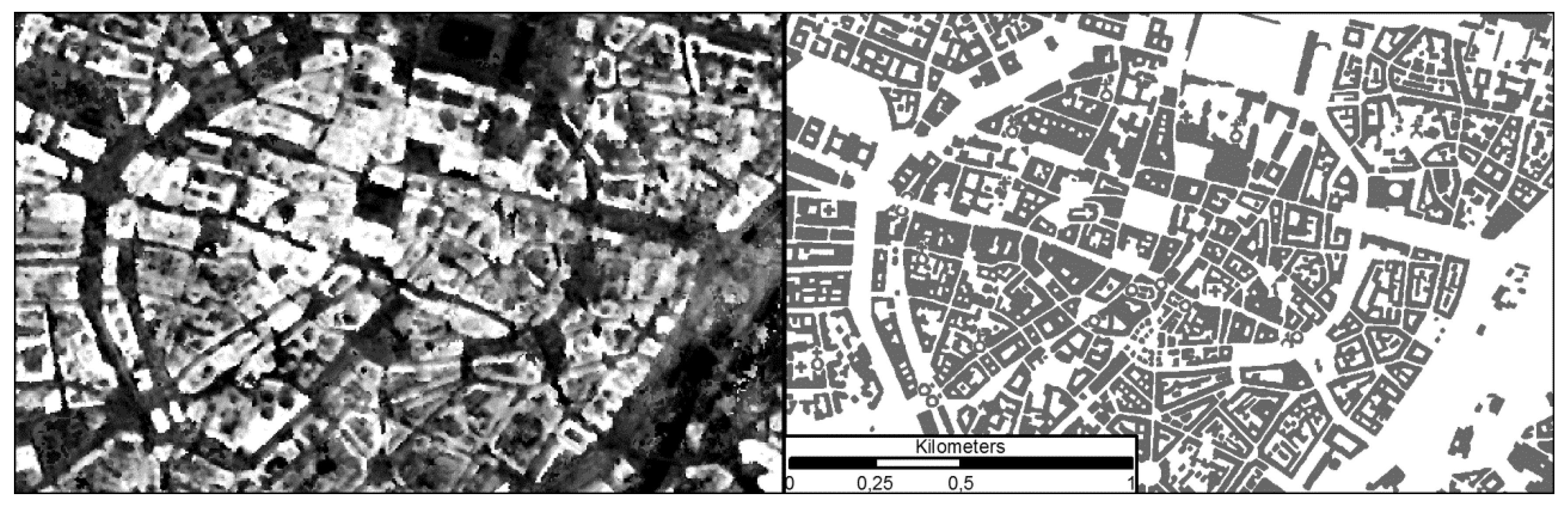 Spatial data input for the generation of the 3D building models using the example of the center of the Munich city region; left: normalized digital surface model; right: extracted building footprint objects from the topographic map DTK25-V. Topographic map: © GeoBasis-DE/BKG (2010), cf. [55].
