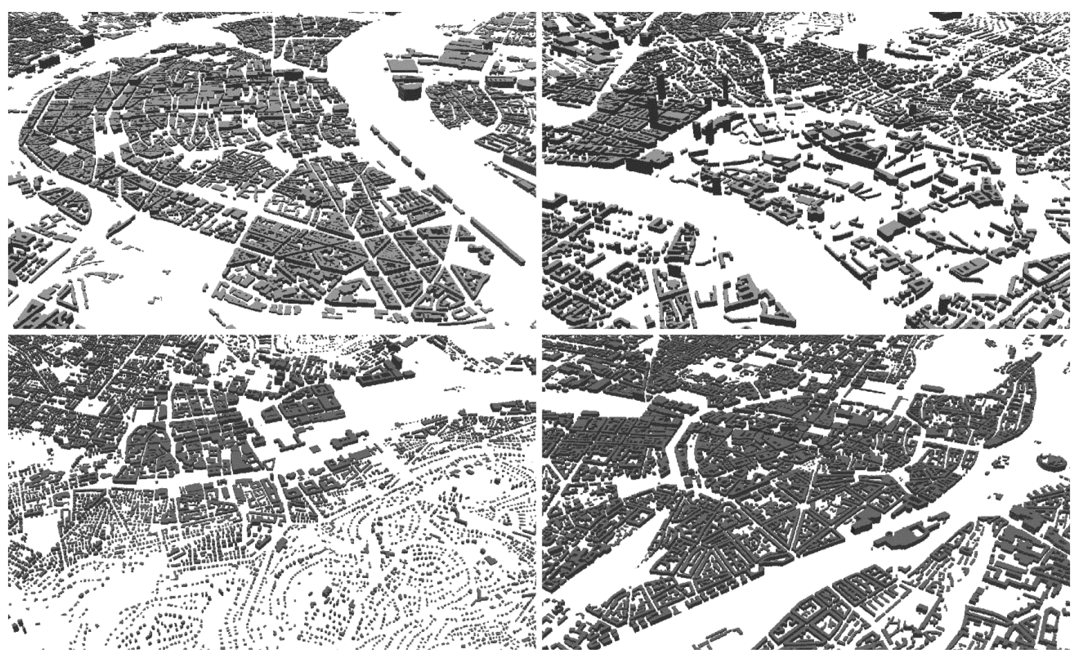In a further step, the large-area 3D building models at the Level of Detail 1 (LoD1) were generated using a combination of the building footprints and height values from the nDSM. LoD1 means that each building is represented by a single building height. A perspective view of the 3D building models of the historic centers of the four city regions is depicted in Figure 3.