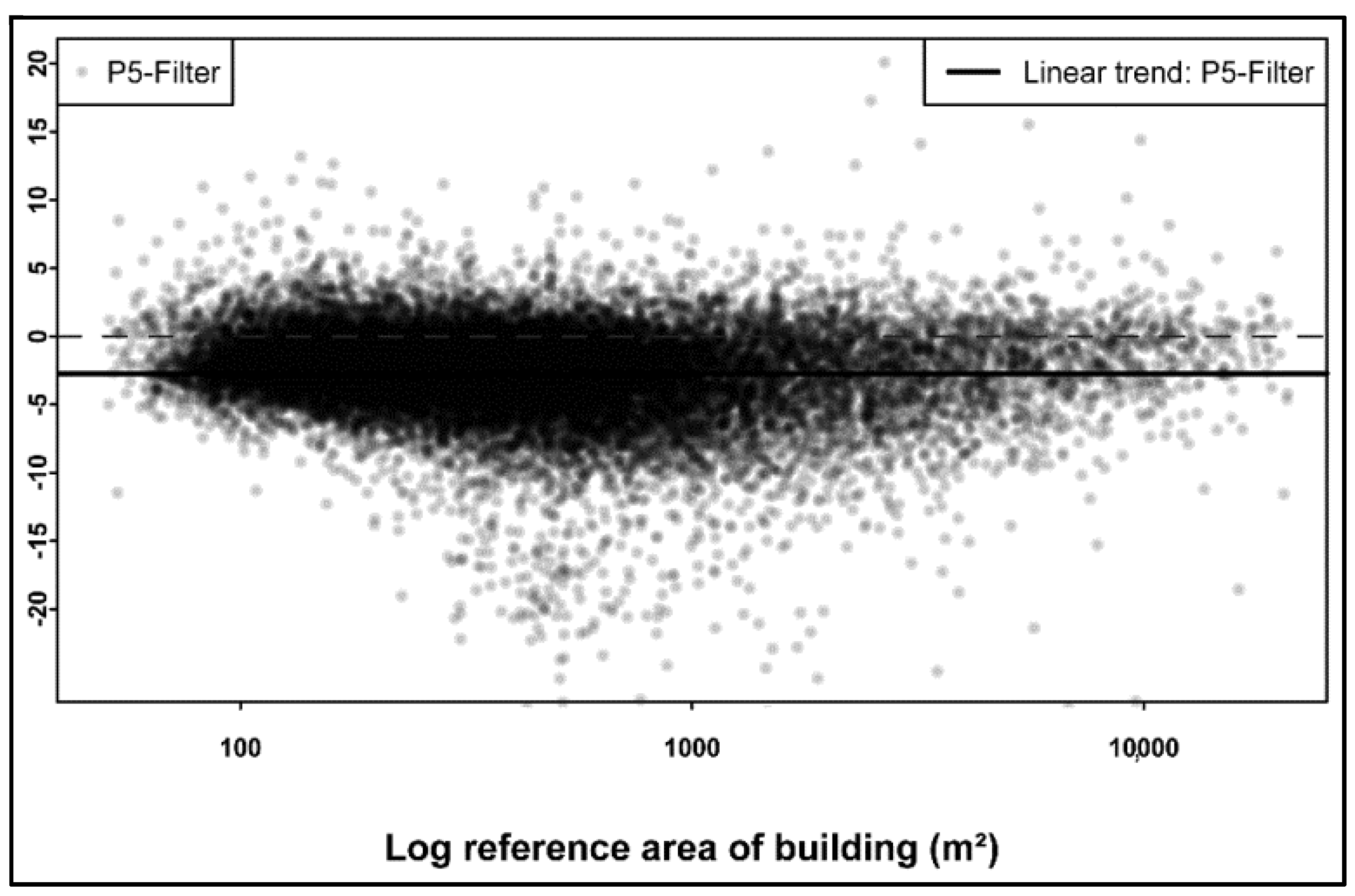 Regarding the accuracy of building height, the study reports the following outcomes: first, an overall agreement between the modeled building heights and the reference data shows a standard deviation of 3.67 m and a mean absolute error of 3.21 m at the spatial level of individual buildings. In a structured analysis, no significant correlation between the building footprint area and the accuracy of the building height could be observed, apart from buildings with very small areas (less than 300 m2; see Figure 4).