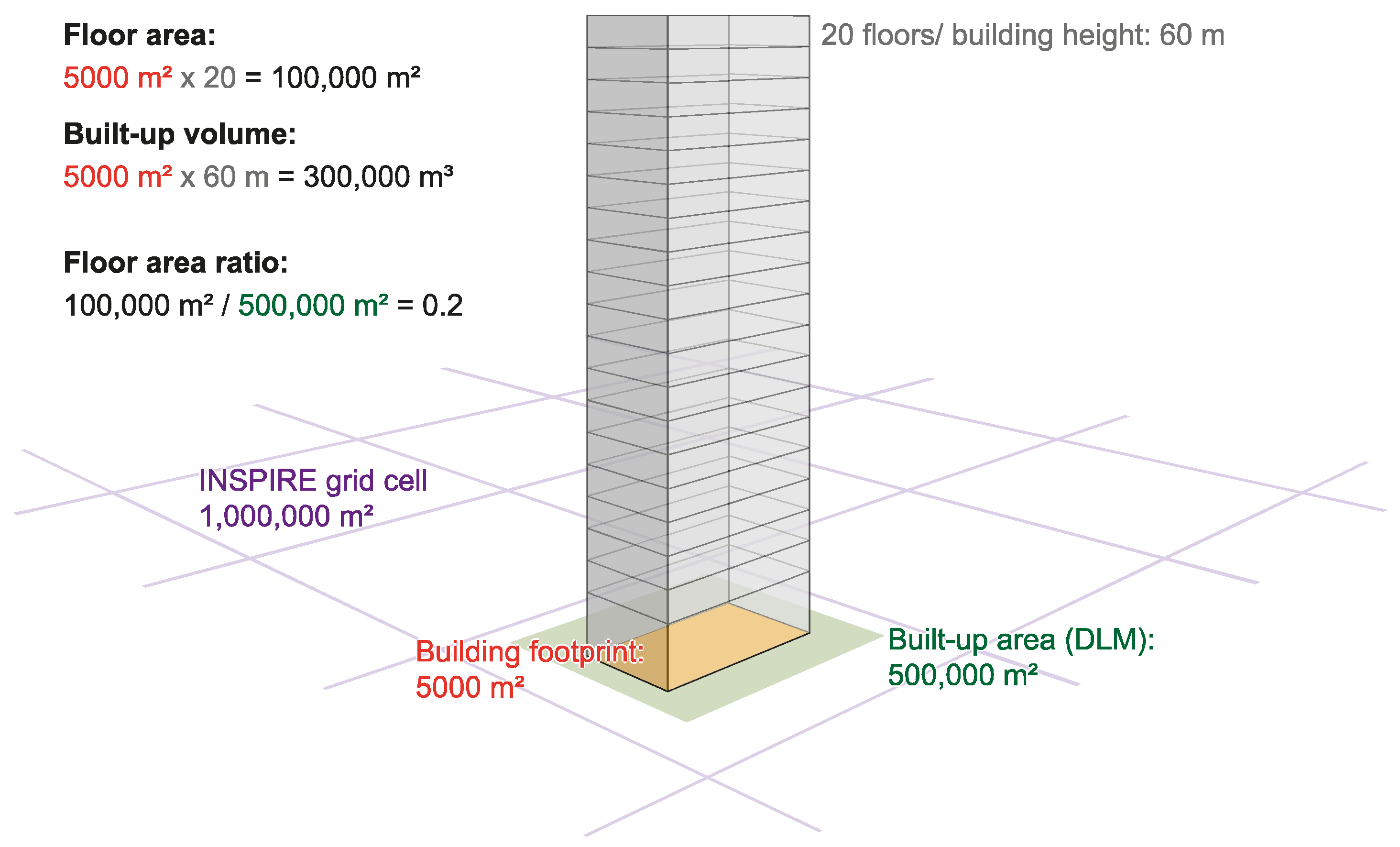 Calculation of built-up volume and FAR per INSPIRE grid cell.