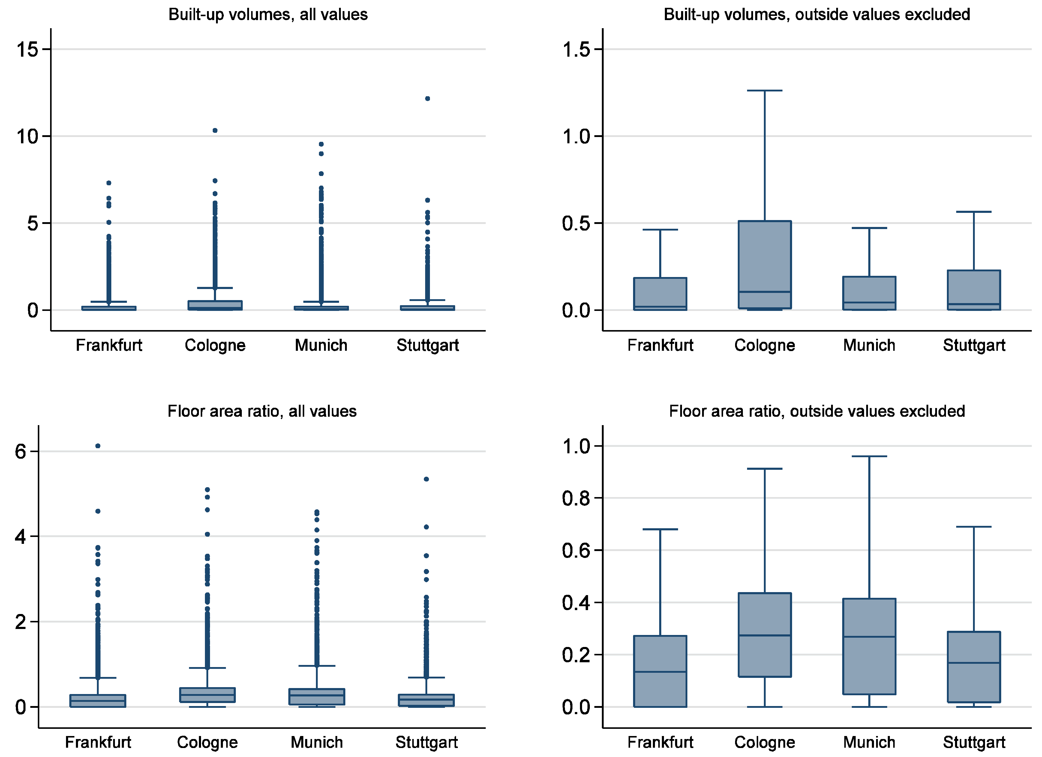 Box plots of built-up volumes (million m3) and floor area ratios.