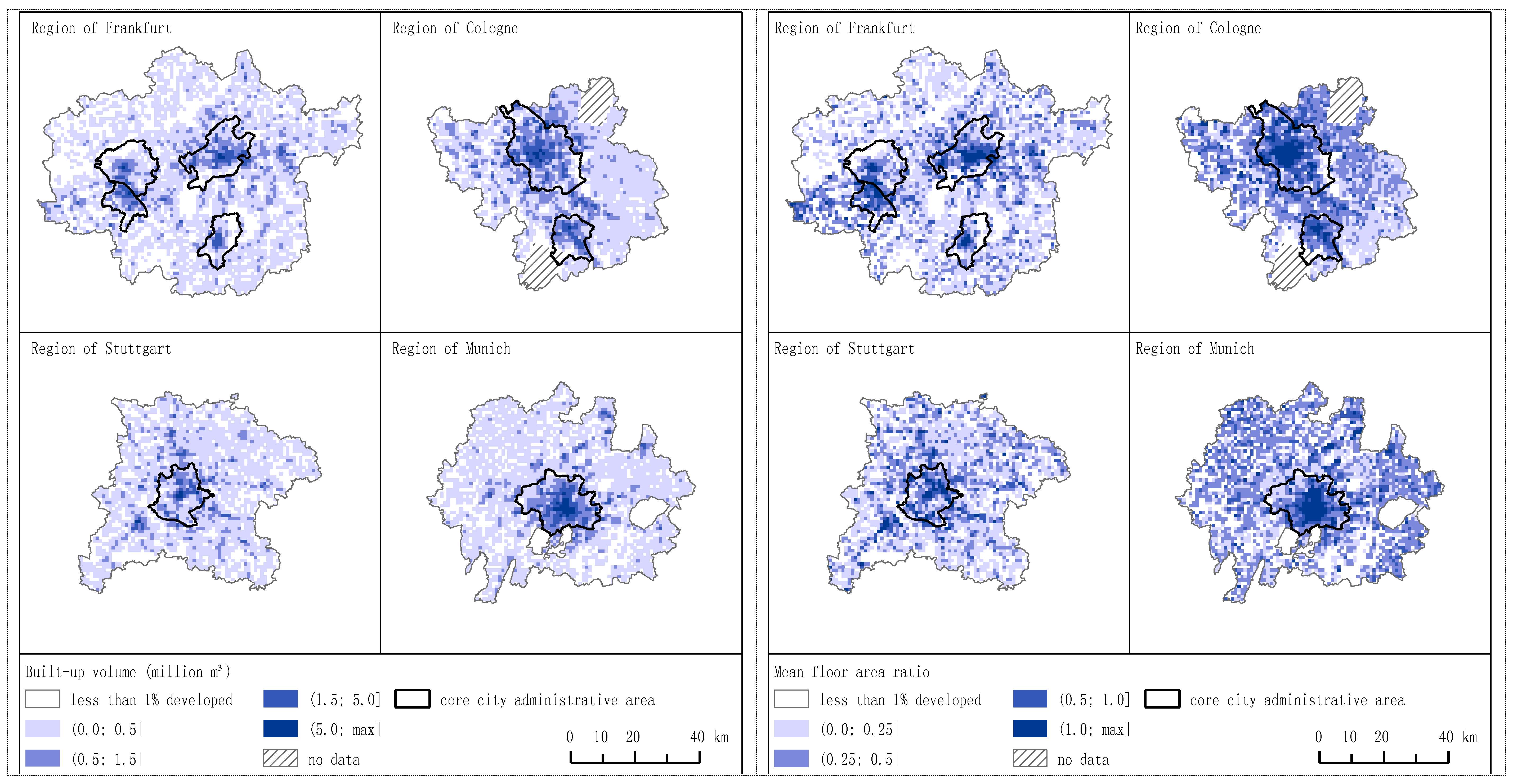 Having these results in mind, Figure 7 provides further insight into this by illustrating the built-up volumes and the average FAR of the four study regions at the spatial level of grid cells (1 km2). Clearly recognizable are the different basic settlement patterns in the regions. For instance, the axial structure of the Stuttgart region stands in clear contrast to the monocentric Munich region. The latter is characterized by a strongly densified core, while in bands of density, the Stuttgart region can be observed stretching from the inner city along the regional rail corridors into the hinterland. By way of contrast, the Frankfurt region is characterized by a rather polycentric and dispersed land use pattern, evident in the concentration of high built-up volume in the inner cities of the four core cities (Frankfurt, Darmstadt, Mainz and Wiesbaden). Upon closer observation, however, it becomes apparent that extremely high built-up volume of over 5 million m3 per km2 can only be encountered in the inner city of Frankfurt. The other three core cities of this polycentric region display consistently lower built-up volumes.