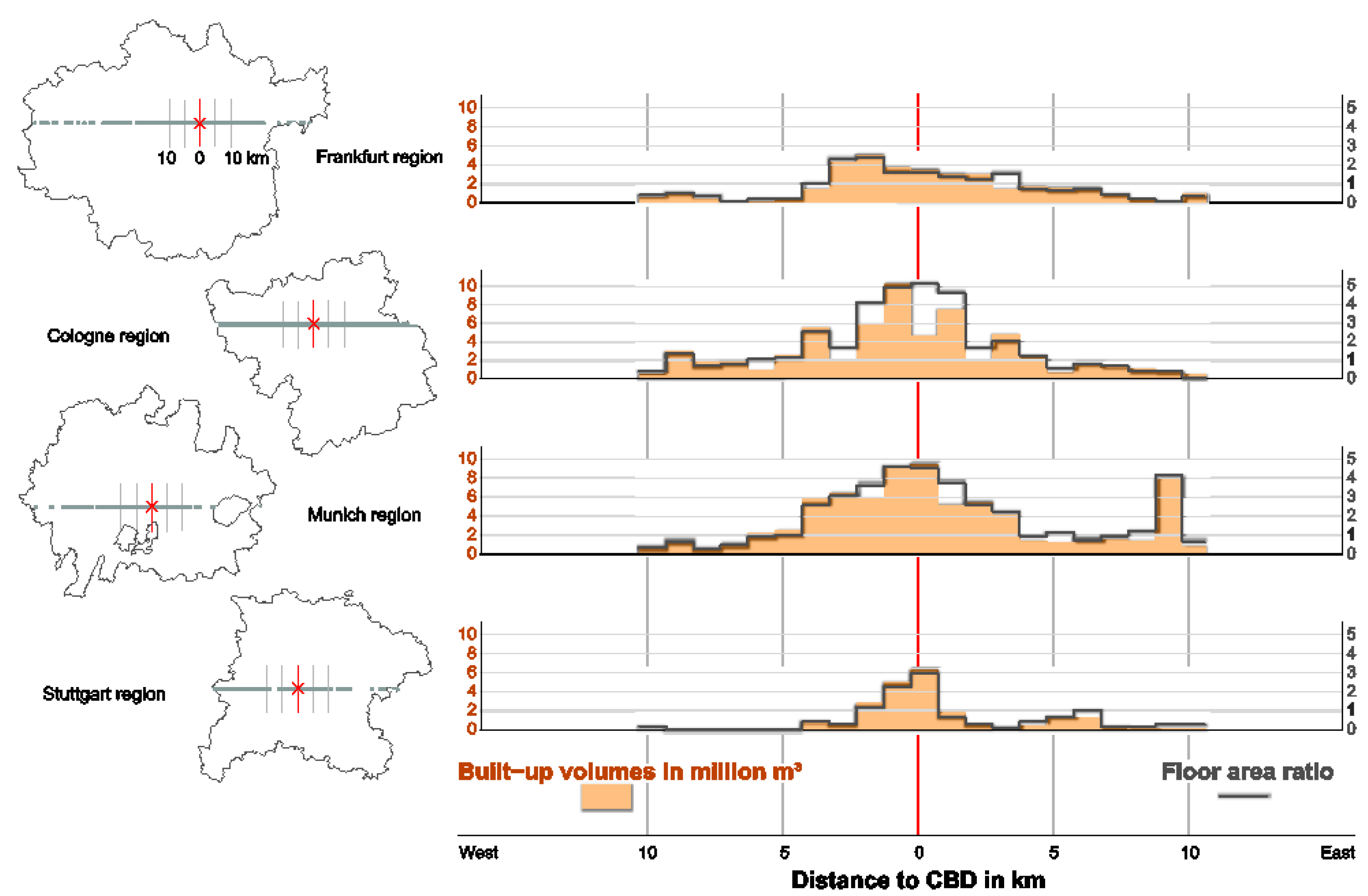 With the methodological approach introduced here, it is, for the first time, possible to conduct a region-wide, detailed analysis of the urban spatial structure that also considers built densities. Previous studies in this field only illustrate urban morphology in a two-dimensional space using socioeconomic and land use data, whereas our approach achieves a higher level of analytic depth. In this way, the relationship between socioeconomic processes and built physical structures can also be examined more closely. Thus, this paper supports a more encompassing and robust understanding of the urban density concept and its variegated applications in urban research and planning practice.