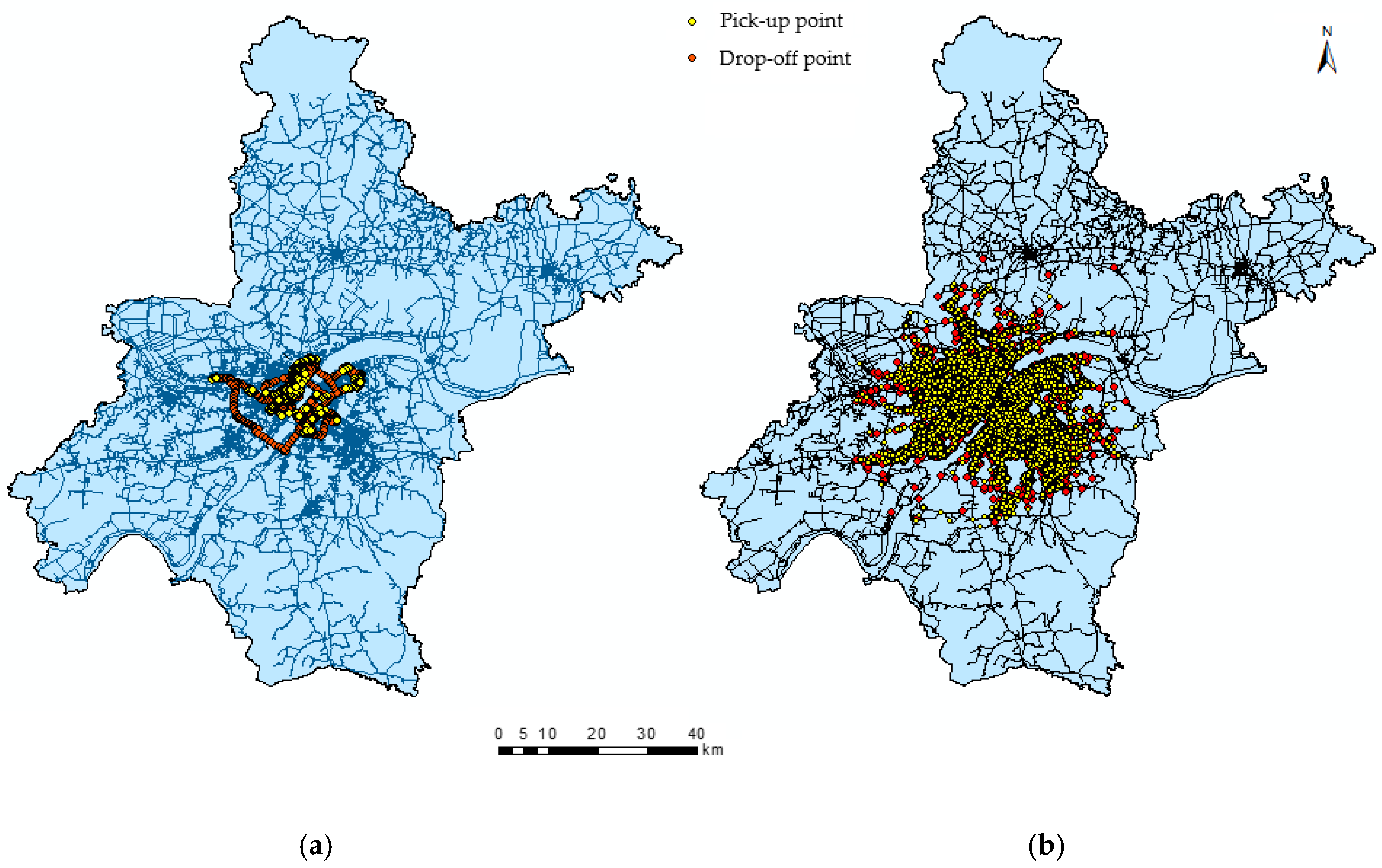 Table 2 summarizes the statistics of the dataset that we selected. Figure 1 shows a map of Chinese cities, indicating where Wuhan is located. As depicted in Figure 2a, a taxicab trajectory within a loop highway was plotted in the map on 2 June 2014. According to the characteristic of taxicab trajectories, especially the recorded GPS points where anonymous passengers were picked up and dropped off during different time periods, we extracted quantities of trips from more than 2050 taxis on different days. Subsequently, each trip was simplified to be a point pair and trip distance, which are represented by a Pick-Up Point (PUP), a Drop-Off Point (DOP) and the Euclidean distance between the two points. At the same time, the two points, PUP and DOP, can be viewed as the origin and destination of a trip, respectively. Therefore, a trip destination represents the purpose of a trip and reflects human mobility. However, it is worth noting that trips less than a certain distance should be removed, as they are often caused by false driver operations or data errors. In this research, the distance threshold was set to be 0.5 km. Figure 2b demonstrates the spatial distribution of all taxicab trajectories on 2 June 2014; yellow points and red points denote the positions of trip origins and destinations on 2 June 2014, respectively, which correspond to pick-up points and drop-off points. Figure 2 illustrates the spatial distribution of pickups and drop offs from the perspective of the number of taxicabs. As shown in Figure 2, the numbers of red points and yellow points present certain differences because of the coverage. In fact, the number of red points is equal to the yellow points because one pickup point corresponds to one drop off point.