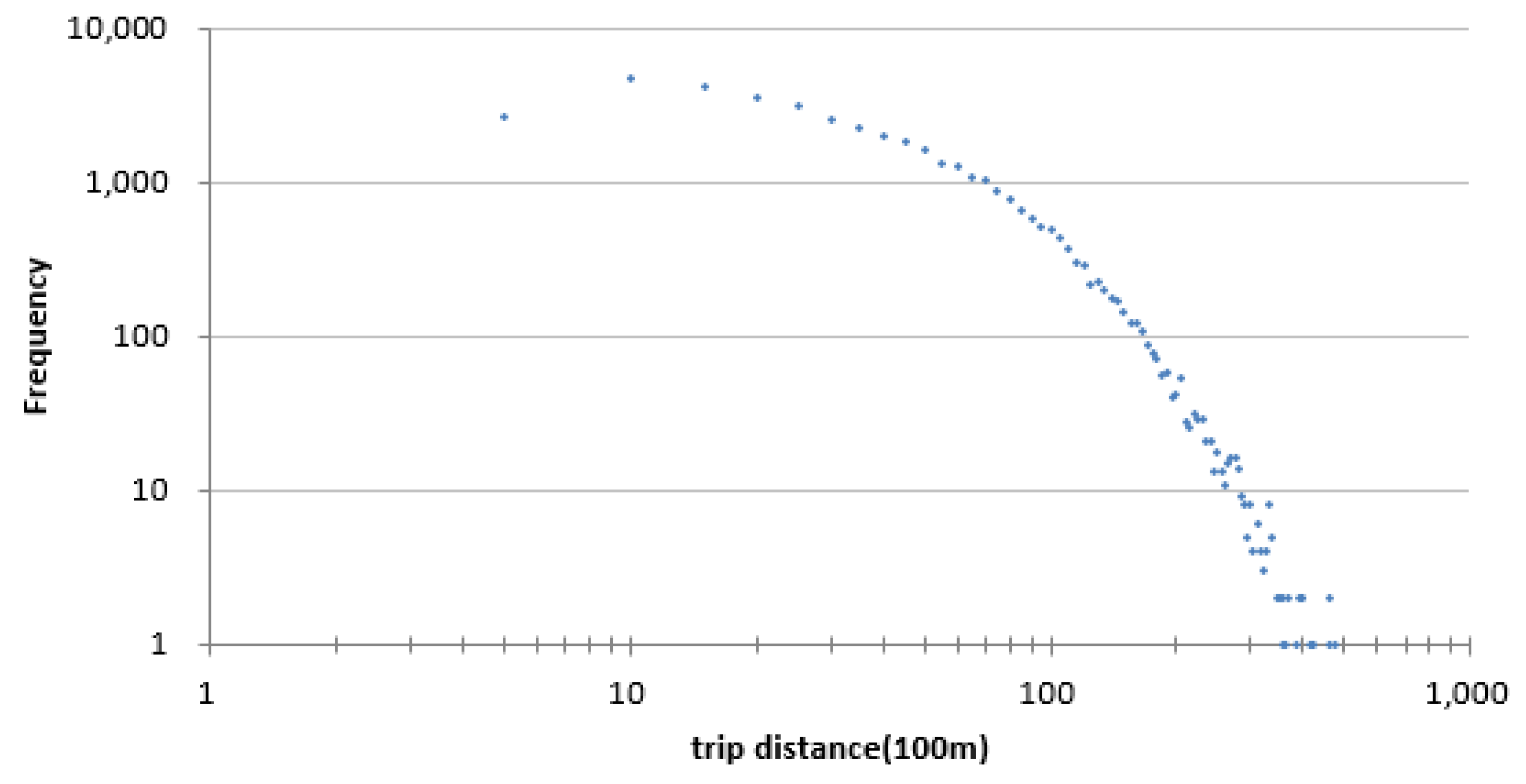 Each trip can be viewed as a displacement of an individual trajectory, and the distance distribution reflects the mobility patterns of people. The observed distribution of extracted distance on 2 June was drawn in Figure 4, as a previous study used an exponentially-truncated power law distribution to fit the distance distribution of taxi trips [23]. It shows that there are more trips corresponding to short distant travel, while it is the opposite for a long trip. In order to better reflect mobility patterns, in Figure 4, we choose one hundred meters as the trip unit instead of one thousand meters [23] because it will appear as a negative value. People travel different distances for different purposes; we divided distance into four categories according to elbows where there exist sharp changes, 1 km, 7 km and 20 km, respectively, as depicted in Figure 4. Taxi trips with different distances could also prove reasonable by the differences in their temporal variations. As depicted in Figure 5, although the temporal variations of PUP with different distances from four groups were different, the distribution of trip distance also presents day-to-day similarity in a week, implying the similarity of human daily activity.