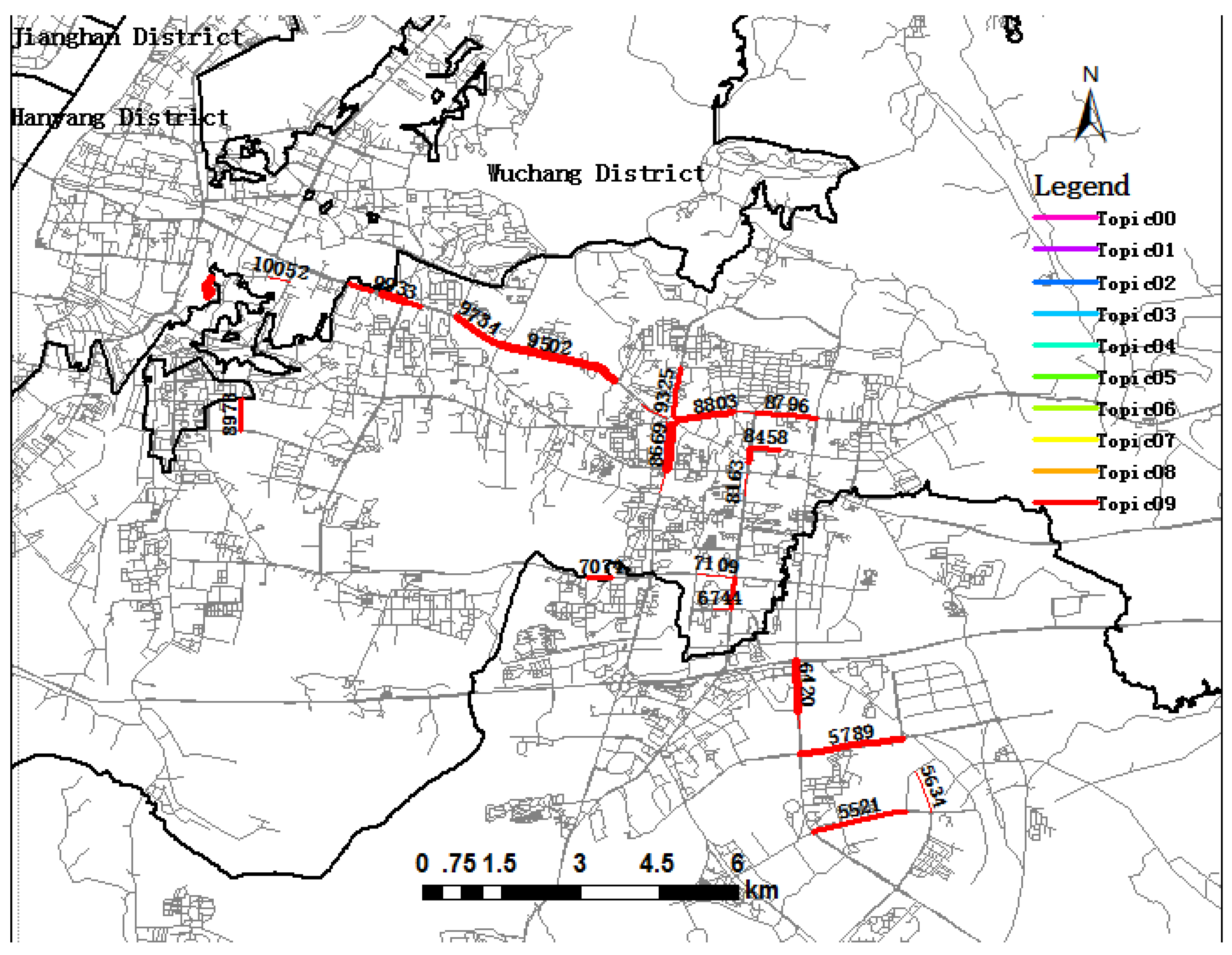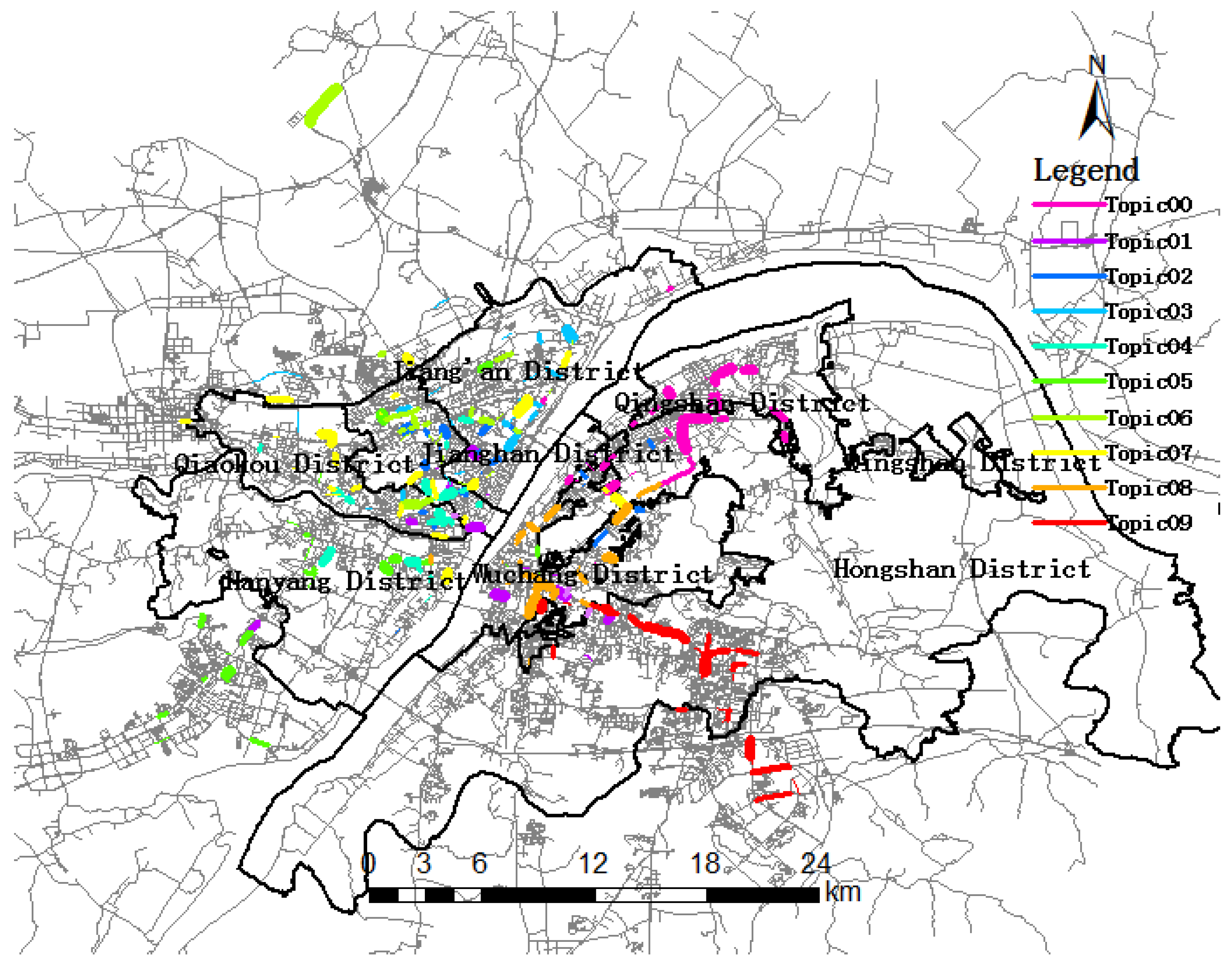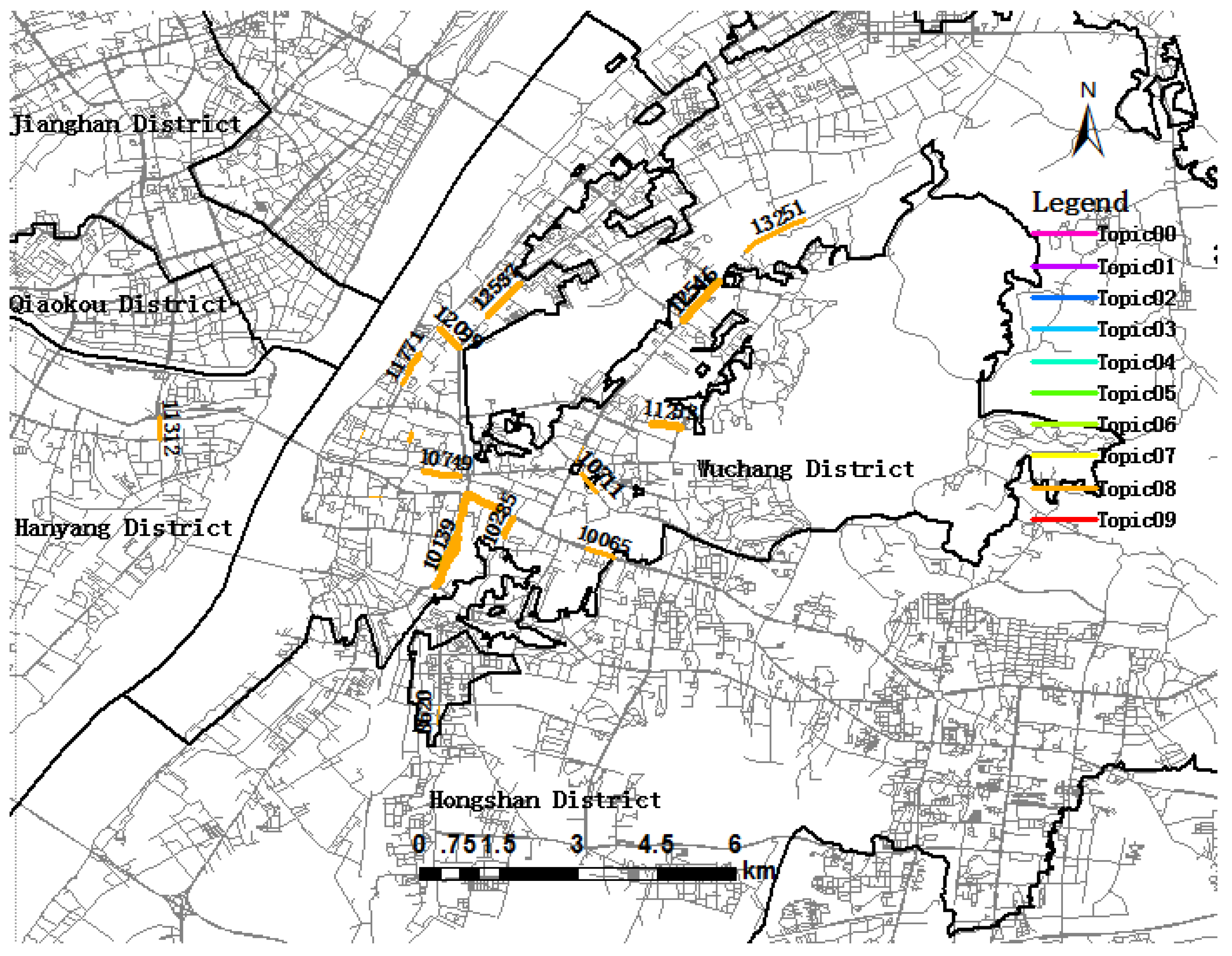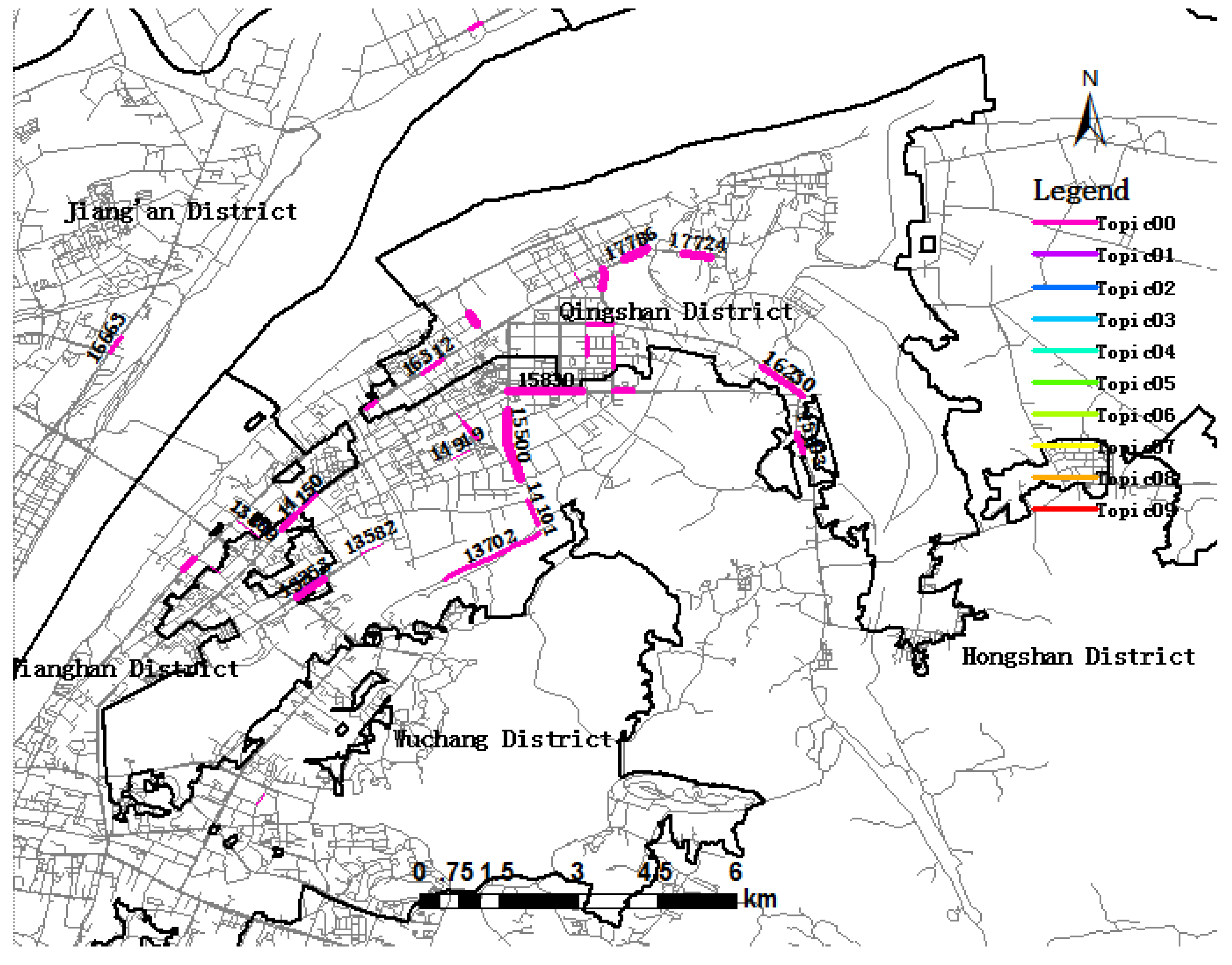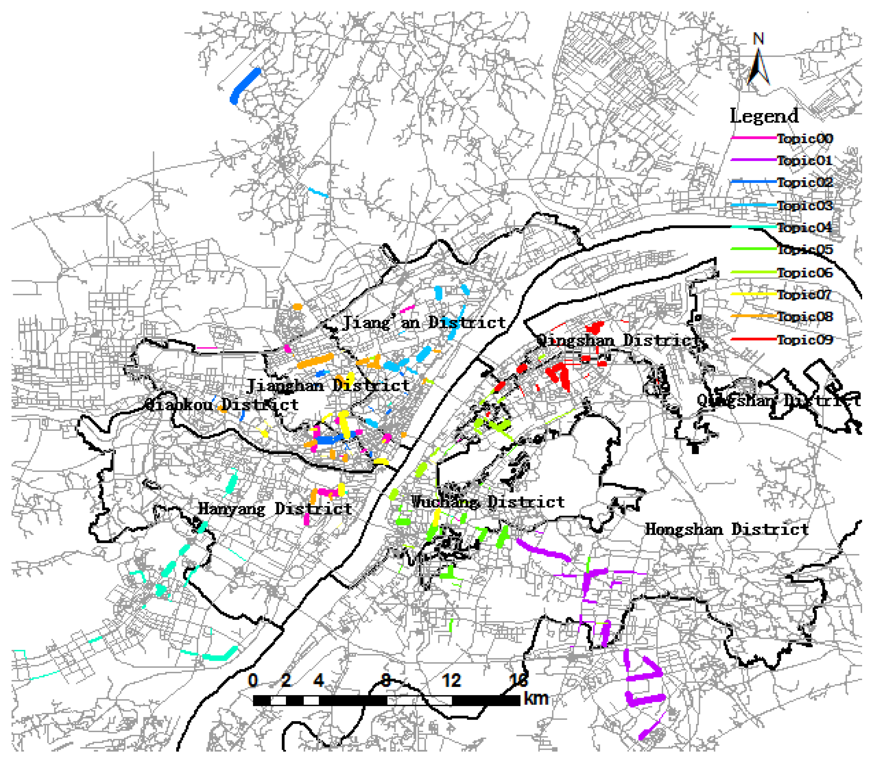 Figure 10 shows that Topic00 was distributed in Qingshan district and Hongshan district. Topic00 mainly contains Link 17786, Link 17724, Link 16992, Link 15500, Link 15830, and so on, including Heping Avenue, Jianshesi Road, Youyi Avenue and Gongye Road. As depicted in Figure 10, some links attract more trip destinations than other links. Link 15500, Link 17786 and Link 16992 are wider, indicating that they attract more trip destinations.
