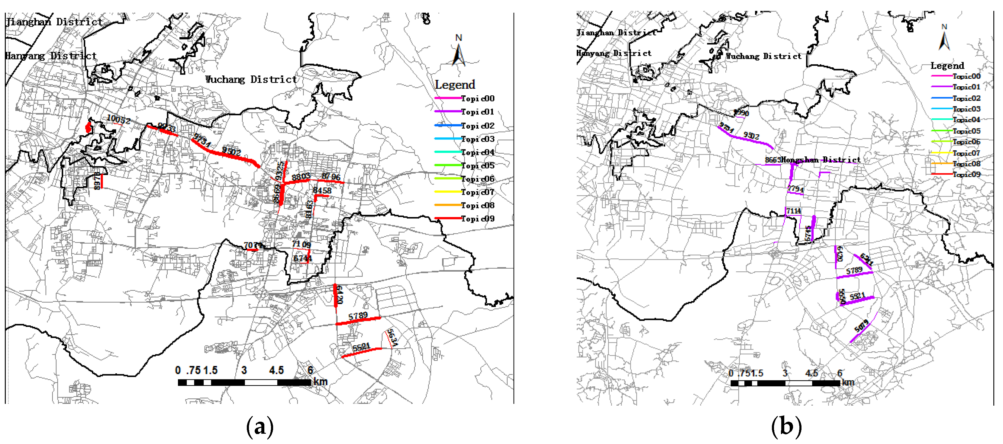 From Table 5, many useful insights can be derived from topic evolution. Most topic similarity is less than 0.5, a smaller value that indicates the difference between “morning rush hour topics” and “evening rush hour topics”. Among them, the biggest topic similarity is 0.53, and the topics are distributed at Luoyu Road and Guanggu Square, which is close to the high technological development zone with many scientific research institutions, enterprises and restaurants. Therefore, it attracts more workers in the morning rush hour and contributes to trip destinations for dinner during the evening rush hour. The topic significance increases by 16.41%, which means more activities happen in the evening. Figure 12 demonstrates the spatial distribution of similar topics during the morning rush hour and the evening rush hour showing the evolution of these two topics. As compared to Figure 12a, new links, like Link 5521, Link 5550, Link 4713 and Link 5079, contribute to trip Topic01 during the evening rush hour. That means there are more trip destinations in this region during evening rush hour. At the same time, there are also links from the evening rush hour fading out compared to those of the morning rush hour, such as Link 10045, Link 8973 and Link 9325. The topic significance of Topic05 during the evening rush hour decreased by 14.23% corresponding to and similar to Topic08 during the morning rush hour, illustrating that the region containing Topic08 has fewer activities in the evening. In addition, the significance of Topic03 in the evening rush hour increased by 20.43%, corresponding to and similar to Topic03 during the morning rush hour, which indicates an activity region in the Jian’an district in the evening.