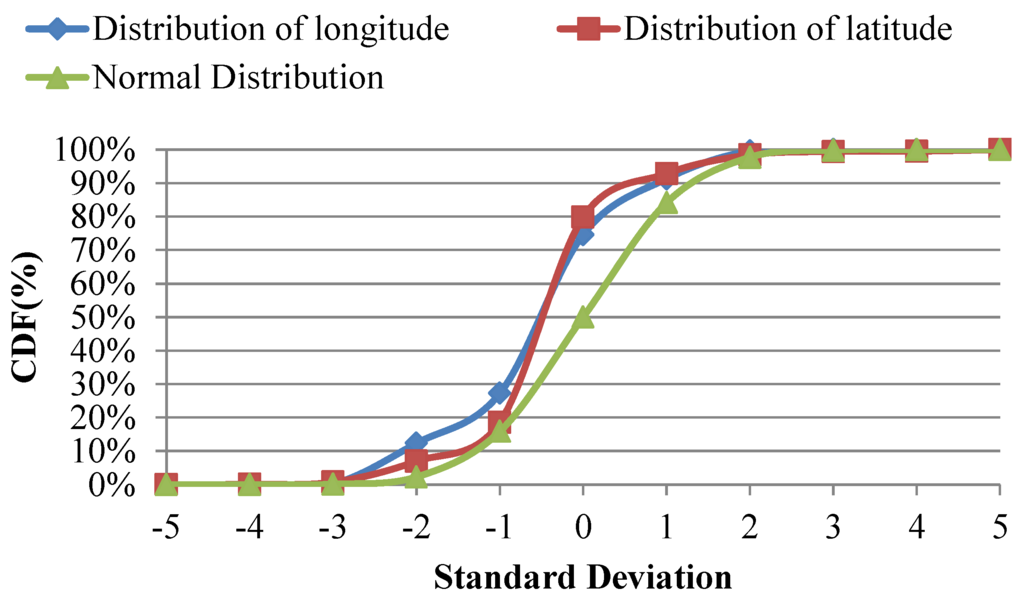 A study of cell-RSSI pair 10721_47366_21 helps to evaluate the assumptions of longitude and latitude distributions. The historical location data of this cell-RSSI pair were collected by the CVO system of Chunghwa Telecom from November 2013 to January 2014. The cumulative distribution functions (CDFs) of longitudes and latitudes based on 13,231 historical records were calculated and are illustrated in Figure 1. The chi-square goodness of fit test [26,35,36] is used to evaluate the distributions of practical data and normal distribution. Chi-square tests of these assumptions showed that χ 2 = 0.653 < χ 11 , 0.05 2 = 19.675 when α = 0.05 for the longitude distribution and χ 2 = 0.414 < χ 11 , 0.05 2 = 19.675 when α = 0.05 for the latitude distribution. No significant difference was observed, so the distributions of longitude and latitude were similar to normal distributions.