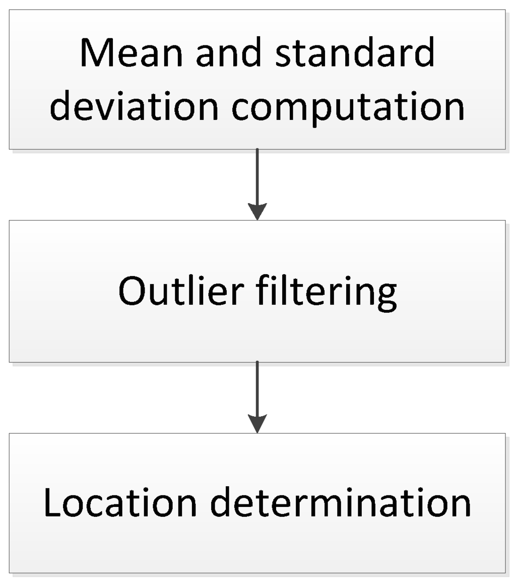 Three steps comprise the mobile positioning method, as follows: (a) computation of the mean and standard deviation; (b) outlier filtering; and (c) location determination (see Figure 2).