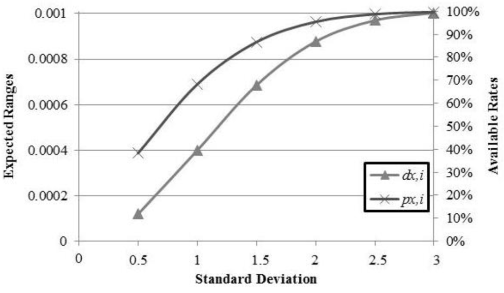 To demonstrate the proposed analytical model, the following parameters were adopted to estimate the expected ranges of the longitude and latitude of the i-th cell-RSSI pair: µx,i = 120.3259728, µy,i = 22.56716916, σx,i = 0.001271737, σy,i = 0.000940652. Figure 3 shows the expected ranges of longitude with different outlier filtering thresholds t. The expected range is approximately 0.001003427 (i.e., 103.03 m) when t = 3 × σx,i (i.e., t = 0.003815211). Moreover, the expected range is 2 σ x , i 2 π = 0.001014699 (i.e., 104.19 m) when t = ∞. Therefore, the improvement of location determination is 1.16 m after outlier filtering with t = 3 × σx,i. However, the availability px,i decreases when the outlier filtering threshold t is decreased. Therefore, there is a trade-off between the location error and availability.