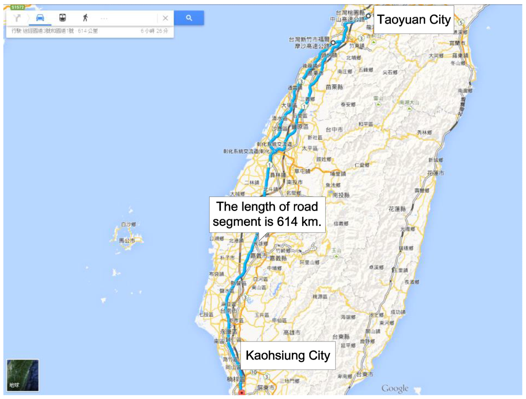 An OBU was selected on 23 November 2013 as a case study to present the results of the proposed mobile positioning method. The experiments were conducted on a highway segment 614 km long between Kaohsiung and Taoyuan in Taiwan (shown in Figure 6).