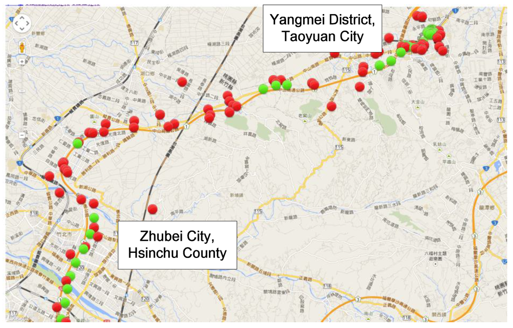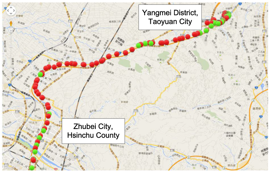 Figure 7 and Figure 8 show the location information of the OBU with different positioning methods. The green point locations were determined by GPS; the red points were determined by mobile positioning methods. In these cases, the GPS satellite signals were weak. Many locations determined with the cell-ID-based positioning method [9] are not properly on the road segment in Figure 7. The results show that the cell-ID-based positioning method cannot provide precise location information. However, Figure 8 shows that the locations determined using the proposed positioning method fit the road segment. Therefore, the proposed positioning method is more suitable than cell-ID-based positioning.