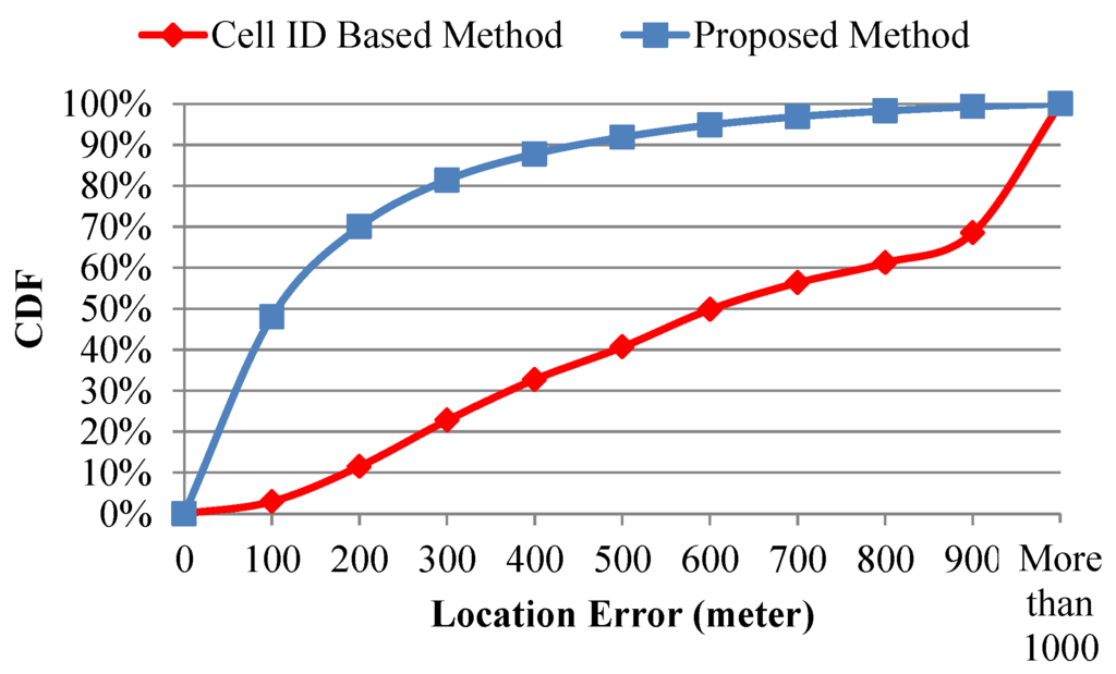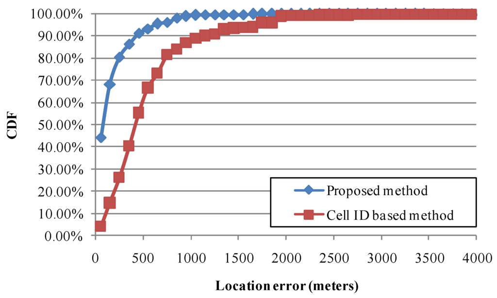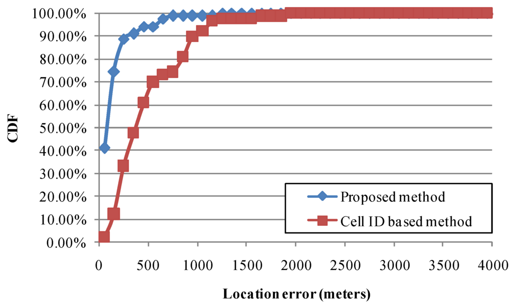 For the analyses of OBU traces, Table 1 shows the practical results of location determination with different positioning methods (i.e., GPS, cell-ID-based method, and the proposed method) on 23 November 2013. The location information obtained from a GPS receiver was defined as the baseline data. In this case, the availability of GPS was only approximately 6.31%, so 93.69% of total records would lack GPS location information. This study compared location information using mobile positioning methods and GPS when GPS was available. The cell-ID-based positioning method [9] was considered to be implemented and evaluated, and the errors in location determination and availability were approximately 521.2 m and 99.51%, respectively. Finally, this study implemented and evaluated the proposed mobile positioning method, and the errors of location determination and availability were approximately 163.7 m and 99.58%, respectively. The CDFs of location errors in this case are shown in Figure 9. In another case, Table 2 and Figure 10 compare different positioning methods on 4 December 2013. The results indicate that the availabilities of the cell-ID-based method and the proposed method are 72.50% and 99.49%, respectively. These results show that the proposed mobile positioning method can provide the precise location information and is suitable for CVO.