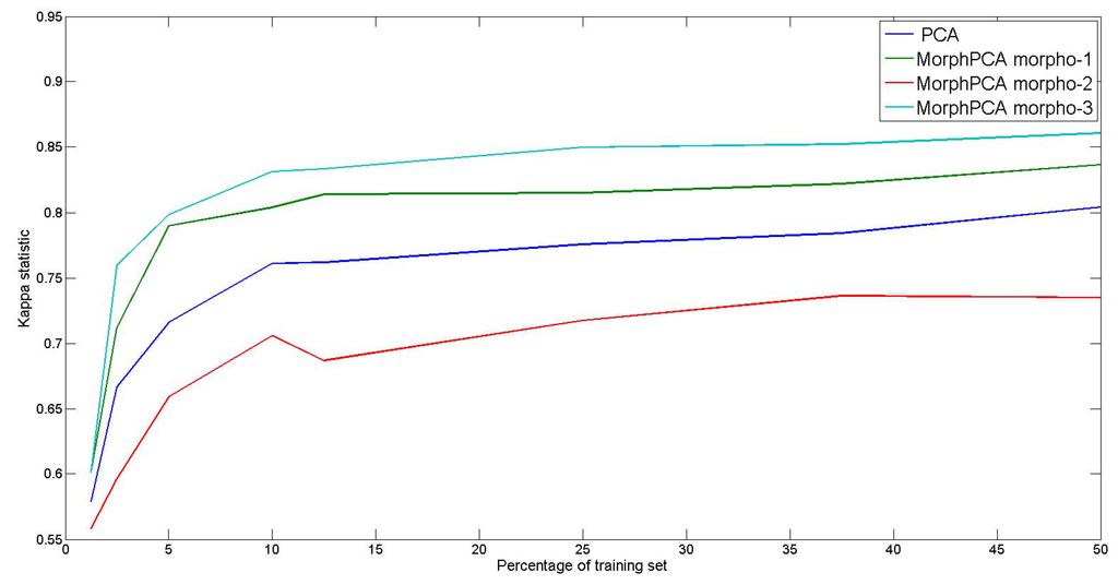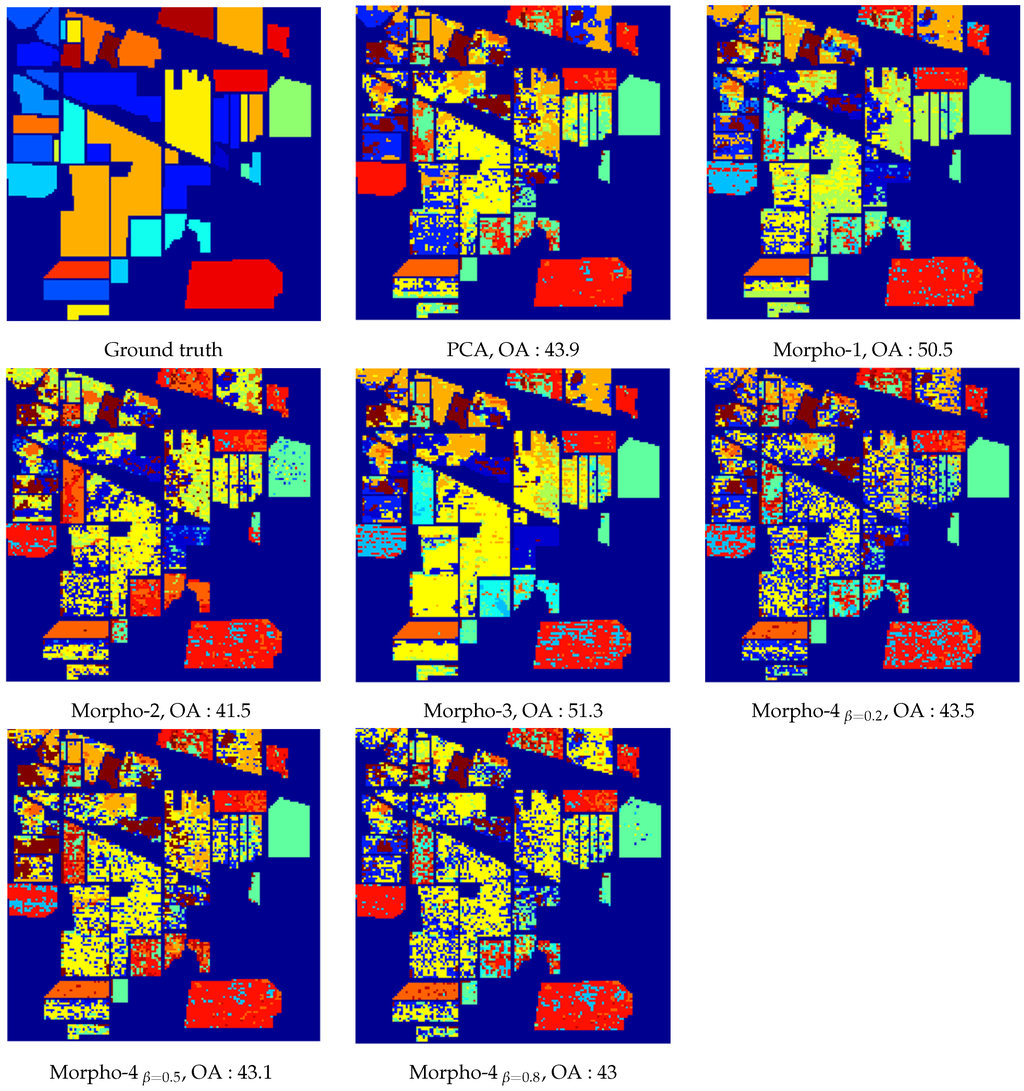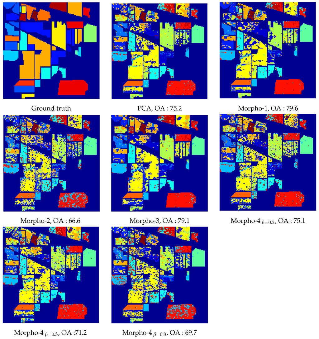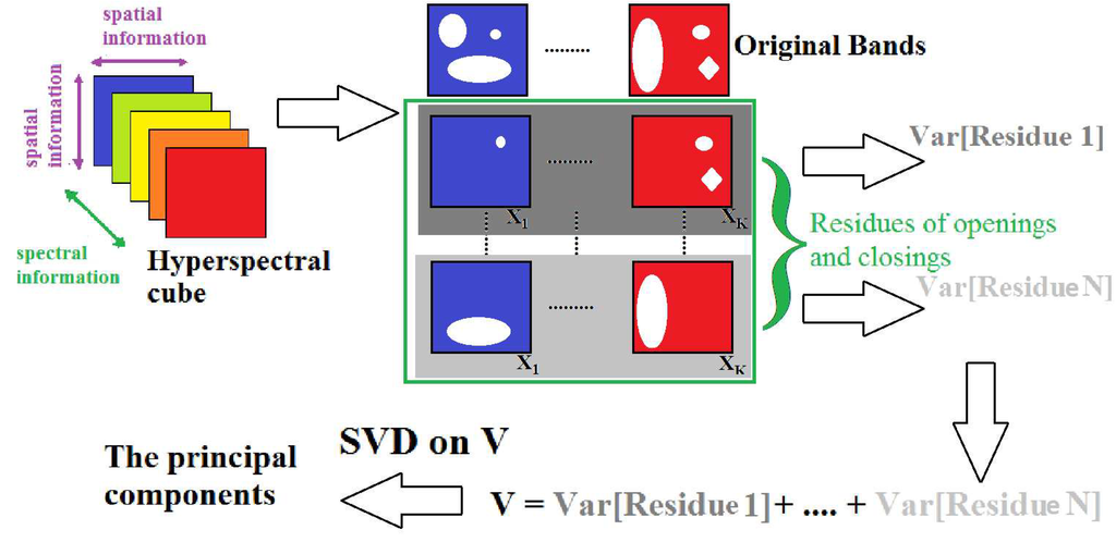 - Franchi, G.; Angulo, J. Comparative study on morphological principal component analysis of hyperspectral images. In Proceedings of the 6th International Workshop on Hyperspectral Image and Signal Processing: Evolution in Remote Sensing (WHISPERS 2014), Lausannne, Switzerland, 24–27 June 2014.