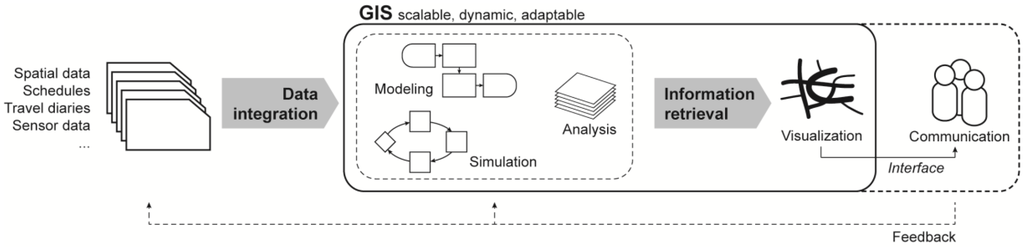 GIS are capable environments for the capturing, management, analysis and visualization of spatial data. They allow for an integration of various data sources into a scalable, dynamic and adaptable geospatial framework (see Figure 1). Through models, simulations and analyses, each with an explicit consideration of the spatial nature of transport, new information can be generated. Besides, GIS also facilitates information visualization which serves as a communication platform with feedback loops to the data integration and the settings of models, simulations and analyses.