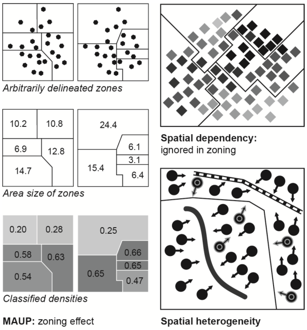 In a standard aggregated transport model, GI systems have been primarily employed for data processing, the delineation of traffic analysis zones (TAZ) and the visualization of model results. TAZ form the spatial reference for demand-based transport models, where the numbers of trips from, to and through these zones are estimated. For these estimations, various socio-demographic, economical and structural data are related to each other in a regression analysis and fed to the model, which then calculates travel demands based on trip production and trip attraction for each TAZ. Spatial dependencies, as well as variations within and spatial relationships between TAZ, are widely ignored at this stage. In the next step of the FSM, the generated trips are distributed over the whole study area. This is usually done in origin-destination (OD) matrices, which exhibit only very abstract spatial information. Using physical models (such as gravity models), the generated trips are distributed according to the OD matrix [8]. The shortcomings of simplistic approaches in demand modeling have been discussed extensively, both conceptually [15] and methodologically [16]. From a geospatial perspective, at least three implications, which we discuss in the following paragraphs, are relevant for any, but especially for aggregated, demand models: scaling and zoning, spatial dependencies, and spatial heterogeneity (see Figure 2).