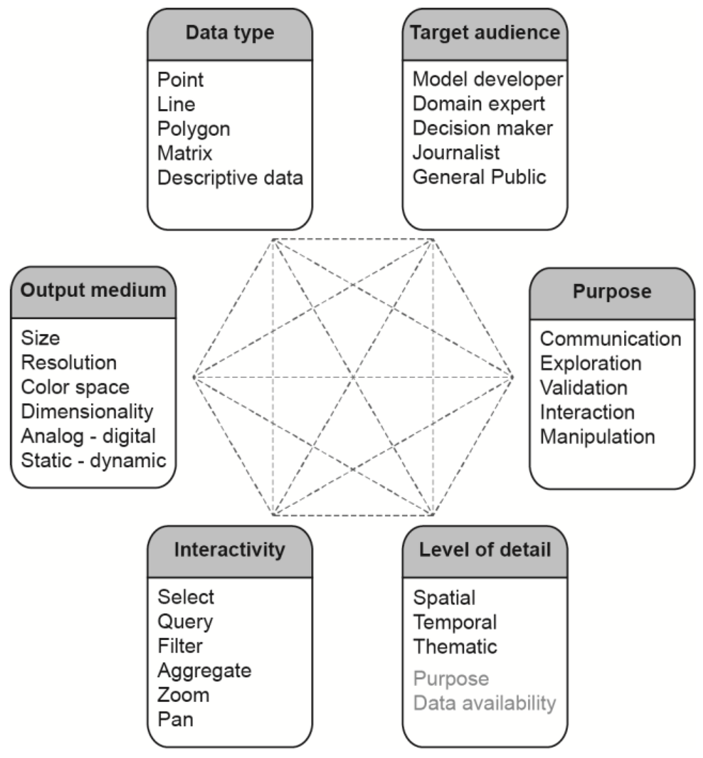 Interdependent dimensions that are relevant for the choice of appropriate (geo-) visualizations of transport data.