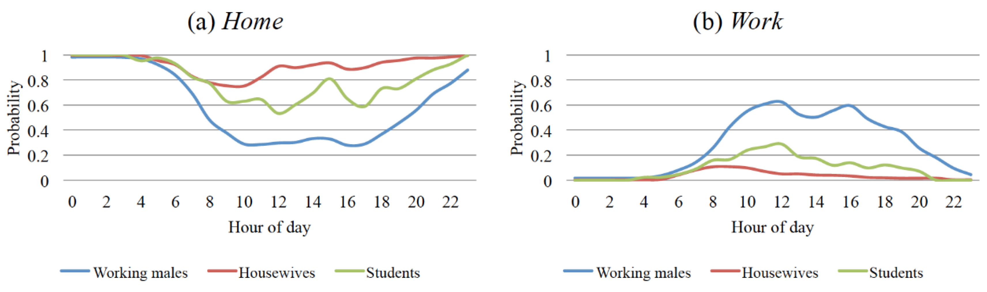 In this section, we report our findings related to typical behavior patterns across the three principal population groups obtained from the data. The results are summarized in Figure 4a,b. As discussed in earlier sections, previous research has found that behavior patterns of people can be explained by focusing on important places such as Home and Work. Therefore, we present the distribution of the key population groups considering only (a) Home and (b) Work locations. The results show clear and evident patterns. The probability of being at Home is the highest for housewives among the three principal population groups. We find more similarity in the probability of being at Work between working males and students for the general population compared to mobile phone users. In spite of the minor difference in the result, we conclude that the behavior patterns extracted from the two sources of data are generally similar.