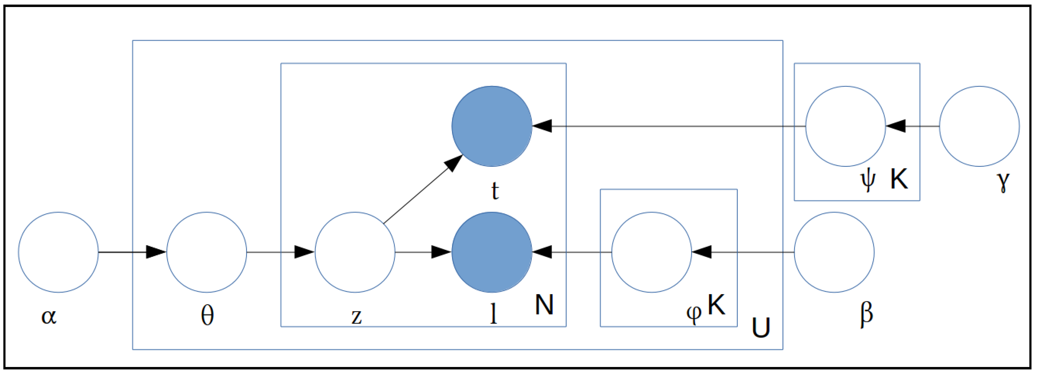 We draw an analogy between discovering a pattern of daily routine from CDRs and discovering a latent topic from documents. The CDRs of each user are considered as a document, and each data point, described by the time stamp and geographical location, is considered as words in the document. The vocabulary in our model describes the temporal distribution and geographical distribution. In this study, we extend the classical LDA model by drawing the time stamp as well as the location from the latent assignment of topic for each record, and assume that people have similar daily routines but different main locations (e.g., home, workplace). Hence, as shown in Figure 2, we place latent variables of time patterns outside the user plate of the model and latent variables of location inside the user plate. The symbols used in Figure 2 are explained in Table 6. To infer the latent variables, a Gibbs sampling [30] inference is applied as shown in Algorithm 1.