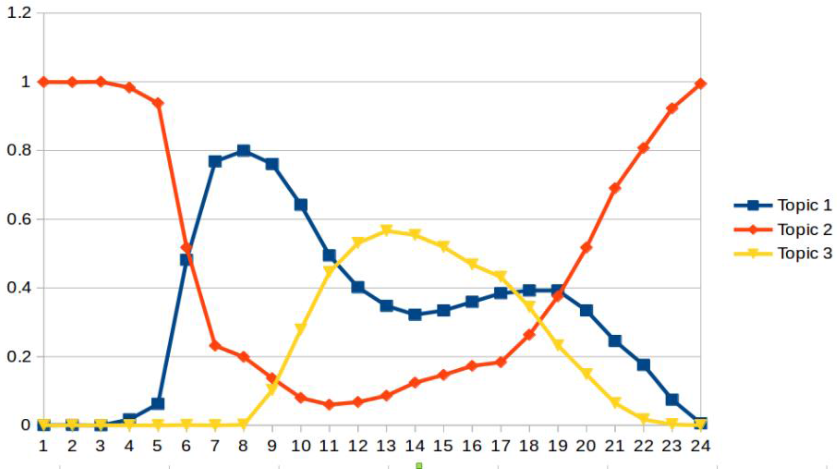We applied our extended LDA model to CDRs of 5000 unique IDs from mobile phone users using the algorithm presented at the beginning of this section. The time pattern that we discovered is shown in Figure 3. We extracted three principal topics as the three typical calling patterns of mobile phone users. Figure 3 illustrates the topic proportion at each time and Topics 1 and 3 depict the calling behavior with a dominating high topic proportion during morning hours and during the day, respectively. Moreover, Topic 2 represents the calling behavior of a preference of call at night than at daytime. The topic is determined by the spatial/temporal topic distribution. Therefore, the patterns in Figure 3 are clustered based on the pattern of calls in relation to the pattern of their periodic visit to the same location. As discussed earlier, locations that are repeatedly visited, such as home and the workplace, can explain the behavior patterns of people. Thus, we conclude that, to a certain extent, the patterns extracted by our LDA model can be associated with some significant locations for mobile phone users.