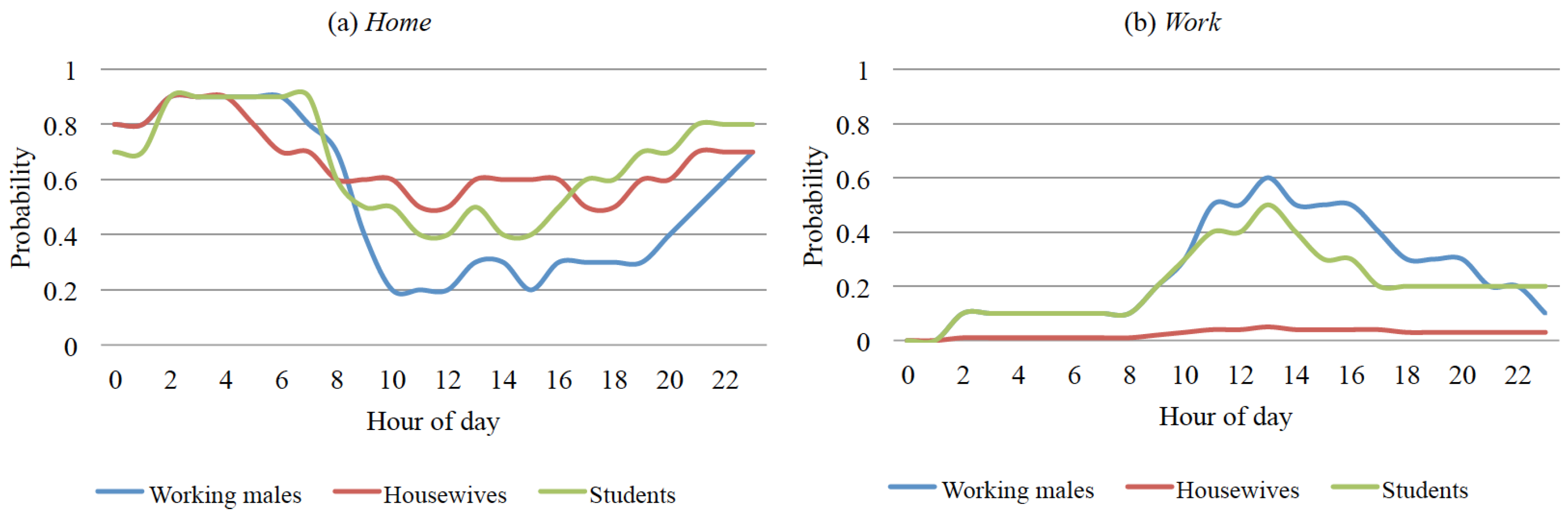 Hourly probability distribution of being at (a) home and (b) work for three principal population groups.
