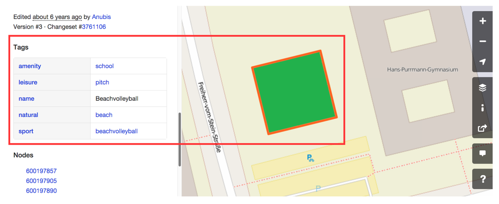 An example of problematic classification in the OSM project: the highlighted entity is classified as pitch, school, and beach, while it is actually a beach volleyball playground in a school.