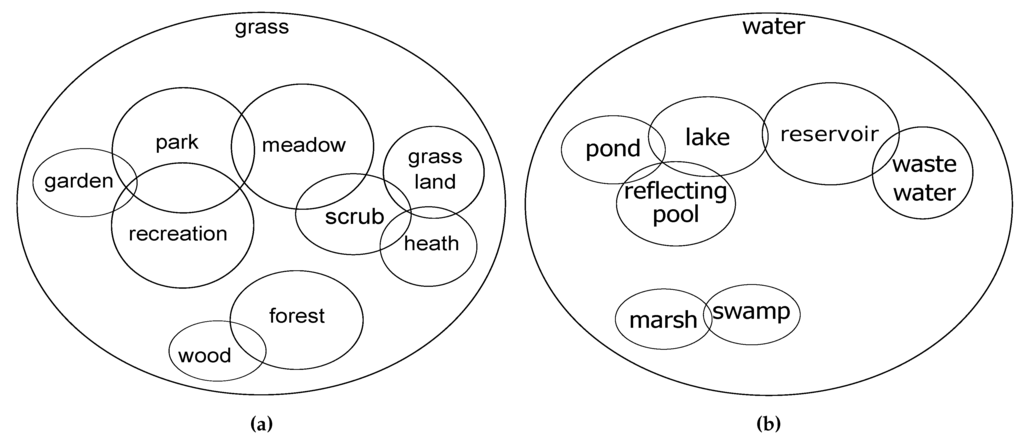 Among others, the features of water bodies, grass-related, and wetland are examples of features with non-strict definitions, and hence, they include overlapping classes. Figure 2 illustrates the conceptual overlapping classes within grass-related and water body features, with respect to the recommendations given in the OSM Wiki. Table 1 describes the mapping between the OSM tags and their corresponding classes. In the OSM project, a single class could be described by various tags; however, we investigate the most common tagging. The overlapping between classes in the figure is based on sharing a particular concept or common characteristics. Moreover, the size of overlapping indicates the degree of conceptual similarity.