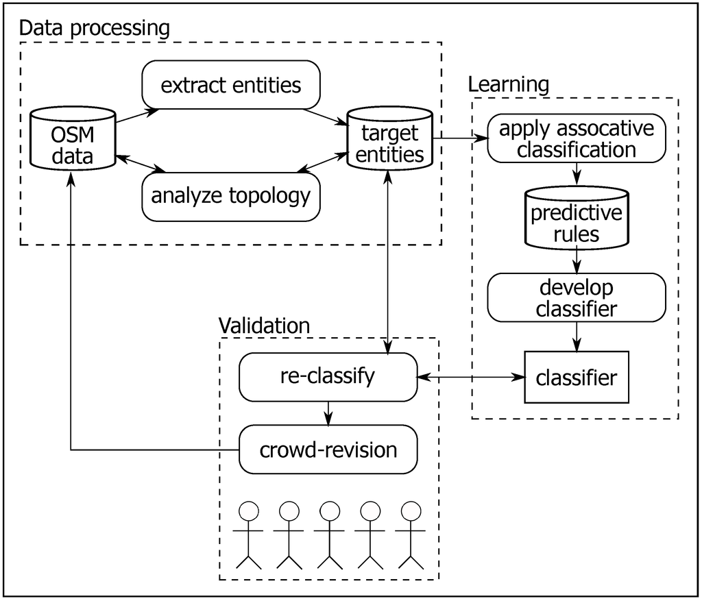 - Validation:Due to the nature of VGI, the proposed approach exploits crowdsourcing to validate the classification. The entities are re-classified using the developed classifier. Afterwards, they are presented to the public again for the purpose of revising the recommended classes. The validation phase has multiple functionalities: (a) enhance/ensure the target entities’ classification by crowdsourcing revision; (b) understand the public conception of target classes; and (c) find out the response of participants to the provided recommendations.
