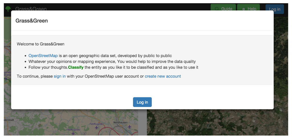 Figure 4, Figure 5 and Figure 6 illustrate the user interface (UI) of the application. The interface usability and ease of use are of concern in order for us to achieve the application objectives and to simulate the nature of VGI projects as well. Before logging in, Grass&Green presents the instructions for use to the participant. As we contribute directly to the OSM project, participants must have an OSM user account. The application allows non-OSM users to register for an account (see Figure 4).