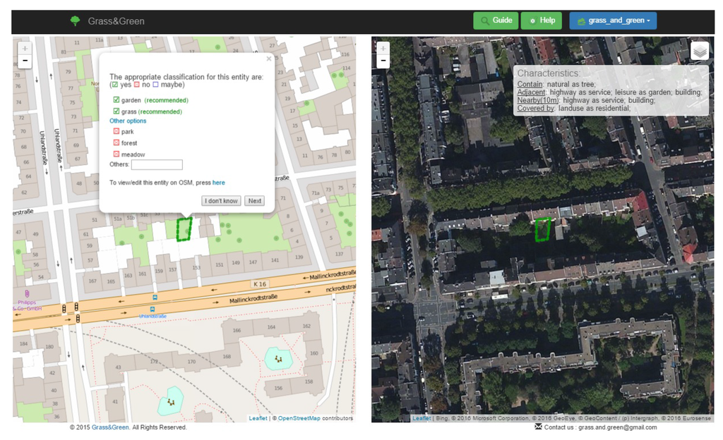 As a validation of the rule-guided classification approach, we developed a web application called Grass&Green. We adopted a web-based architecture to reach a broad number of participants. The application launched in August 2015 and targeted at public participants and OSM mappers as well. The application is hosted on an Ubuntu [65] server as a sub-branch of the OpenScienceMap (OScieM) project [66].