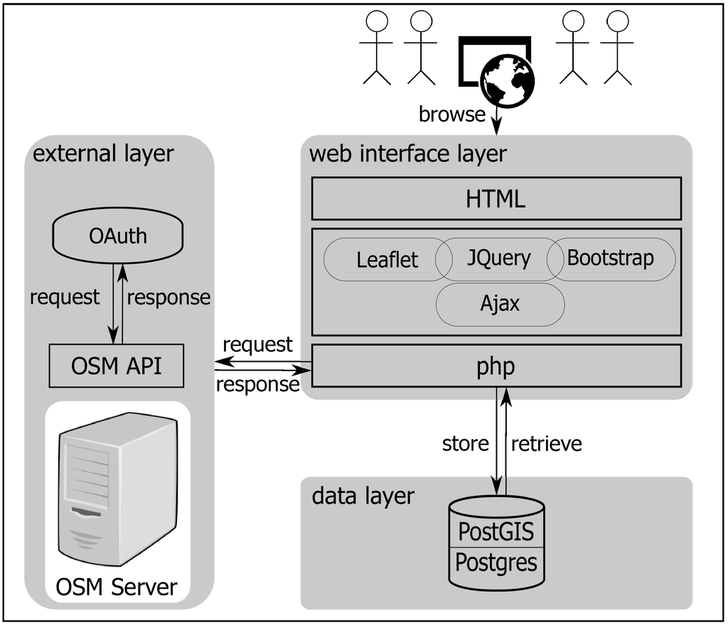 Using any internet browser, the participants can access the interface layer. First, the participants login to the application using the authorization open standard of OAuth [71], which allows them to connect to a third party website—in this case, the OSM project—in a secure way without exposing their password. After successful login, the interface layer, by means of AJAX and PHP, starts to call the data from the data layer for the validation process. By means of php functions, the application controls the validation results and participant contributions. The data layer contains the data set developed by the proposed approach in [17]. In the data set, each entity is associated with its topological qualitative characteristics, its geometry, and two recommended classes. The data set is stored in a Postgres data base with postGIS extension to handle the geometry of entities. As an external layer, the OSM server is accessed through the OSM Application Program Interface (API). We used the OSM user account as a reference to participant experience and their geographic origin. During the validation, participants have options to edit/view the presented entities by OSM editors/viewers. In addition, the interface layer calls the OSM API to update the entities after the validation process.