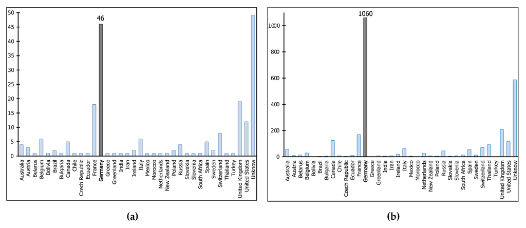 Taking into account that we used simple declaration approaches, Figure 8, Figure 9 and Figure 10 give insight into the patterns of participants and contributions. The application attracted 212 participants: 163 participants have a known origin of location from 35 different countries while the others are from unknown locations. Figure 8a shows that 46 (about 28%) out of 163 participants are from Germany. In addition, the participants examined the classification of 2,865 entities; 1,060 out of these entities have been checked by participants related to Germany, as shown in Figure 8b, which is relevant to the data set used here. The rest of the entities have been checked by participants from different locations.