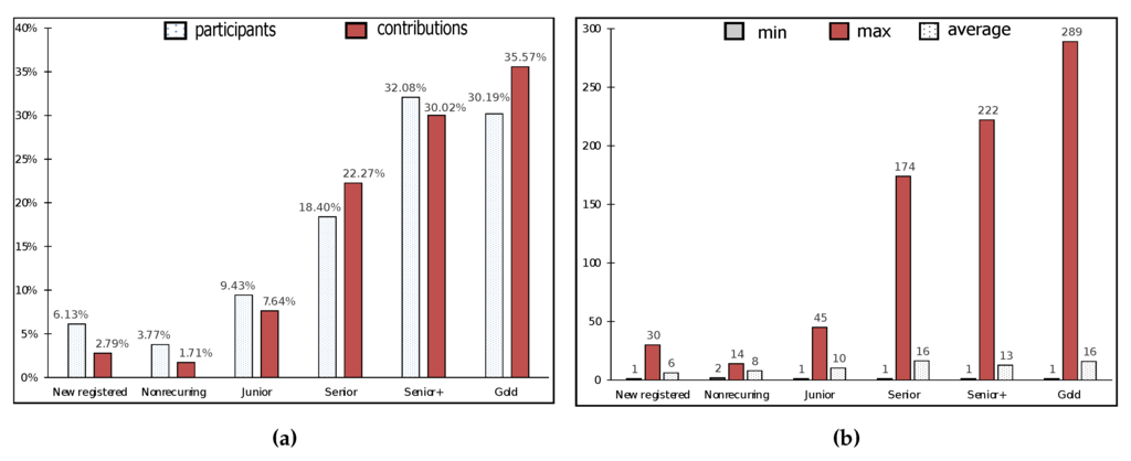 Figure 9a shows the distribution of participants and contributions per group as follows: 30.19% Gold 2000), 32.08% Senior (500 changesets < 2,000), 18.4% Senior (100 changesets < 500), 9.43% Junior (10 changesets < 100), 3.77% Nonrecurring (1 < changesets < 10), and 6.13% New registered (changesets 1). In Grass&Green, about 65% of contributions are from Senior and Gold mappers, which adds reliability to the obtained results. Figure 9b shows the minimum and maximum contributions of participants per group, in addition to the average contributions per participant. This figure indicates that the more experience and familiarity of a participant with the OSM project, the more they are concerned and contribute. Figure 9b shows that the participants from Gold, Senior, Senior, and Junior groups examined on average between 11–16 entities/participant, while participants from Nonrecurring and New registered groups checked on average between 6–8 entities/participant. The finding shows some extreme concerns of individual contributions of 289, 222, and 174 entities from participants belonging to Gold, Senior, and Senior groups, respectively.