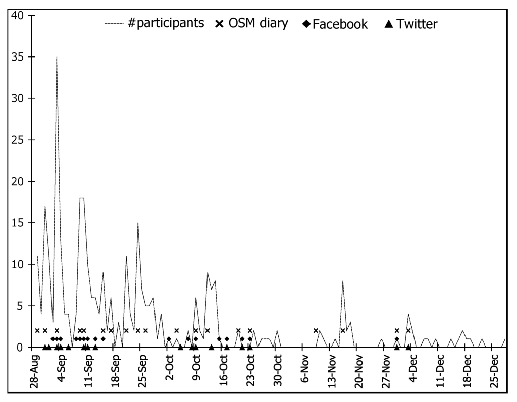 Figure 10 shows the contribution patterns relative to the utilized announcement methods. After two weeks, the number of participants are mostly less than ten per day. The figure shows that the number of participants decreases with time and increases with using an attraction method, particularly the OSM diaries.