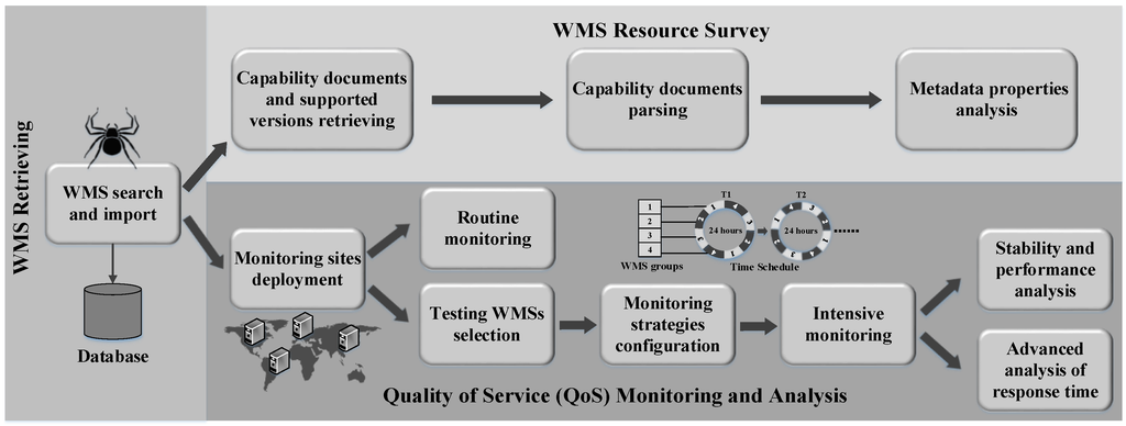 The data collection and analysis workflow is illustrated in Figure 1. First, WMSs are discovered using a developed topic crawler. After importing the crawled WMSs into a database, the WMS resource survey and QoS analysis were conducted. The WMS resource survey is based on service metadata (i.e., capabilities documents retrieved from GetCapabilities operation). QoS analysis is based on our monitoring result on the two mandatory operations, GetCapabilities and GetMap. Routine monitoring permits acquisition or updating of long-term QoS behaviors (e.g., stability, performance) and the availability status (whether the URL is not valid any more) of all WMSs, while intensive monitoring captures the spatiotemporal features of QoS for selected services.