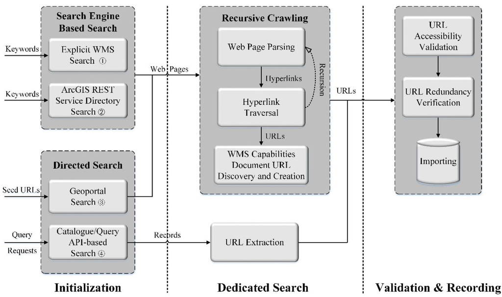 The WMSs investigated in this research were all collected from the World Wide Web by our active topic crawler [56]. The discovery workflow is illustrated in Figure 2. To collect as many WMSs as possible and to ensure the global coverage of collected WMSs, the crawler adopted a hybrid search strategy that integrates search engine-based search and directed search. Common search engines (e.g., Google and Bing) have powerful crawling and indexing capabilities that capture global web pages. Therefore, a search engine-based search guarantees the breadth of search and, therefore, ensures that our search can reach the regions of the web indexed by common search engines. More to the point, WMS is a type of domain-specific web resource, usually published through geospatial web portals and catalogues, such as the OGC Catalogue Service for the Web (CSW). We used directed search to make a dedicated search of these SDIs using standard APIs and web page crawling. Reputable SDIs (e.g., data.gov [31], GEOSS clearinghouse [30], EuroGEOSS broker [57]) and other geospatial web portals found through search engines were set as seed pages.