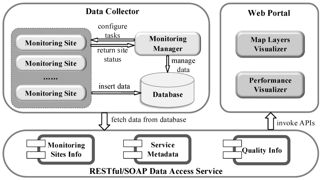 To collect QoS monitoring data from geographically-dispersed monitoring sites, we developed a distributed monitoring framework that consists of three components (Figure 3); (1) The data collector collects service metadata and real-time performance data of WMSs using a group of monitoring sites. Each monitoring site monitors the assigned WMSs in parallel using multithreading technologies. A monitoring manager configures and coordinates the monitoring tasks of all monitoring sites and is in charge of data management; (2) The data access service provides both the RESTful and Simple Object Access Protocol (SOAP)-based web service APIs to retrieve monitoring data (e.g., monitoring sites, service metadata and historical performance in a given time period); (3) A web portal, developed based on our previous research [60], visualizes the layers, service performance, as well as the spatial distribution of the monitored WMSs and monitoring sites using maps and charts.