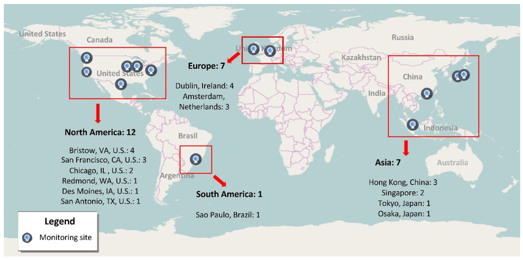 From September 2014 to November 2015, 27 public cloud-based (Windows Azure) monitoring sites dispersed at 13 locations were deployed on four continents and in seven countries (Figure 4) in total. All monitoring sites were employed with the same virtual machine configuration, including the network, computing resources and operating system to avoid any impact on monitoring results as much as possible. Four monitoring sites located in U.S. (Bristow, VA; Redmond, WA), Ireland (Dublin) and China (Hong Kong) were constantly employed for routine monitoring from September 2014 to November 2015. The remaining 23 monitoring sites from 12 locations were set up for intensive monitoring from 23 August 2015 to 3 October 2015. At any time point during intensive monitoring, 12 sites from 12 different locations were selected to conduct monitoring simultaneously; other sites from replicated locations were used as alternatives.