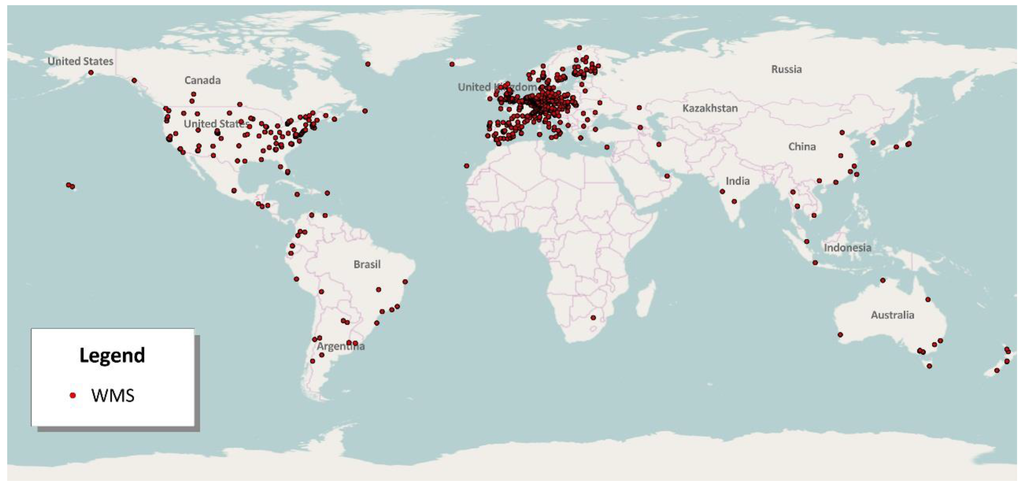 Investigating global online geospatial web services is essential for geospatial resources discovery and a better understanding of the status of online resources [27,28]. Spatial Data Infrastructures (SDIs) have been widely used in Earth science domain to facilitate geospatial resources discovery and sharing [29]. Catalogues and portals, such as Global Earth Observation System of Systems (GEOSS) Clearinghouse [30] and data.gov [31], maintain millions of metadata entries for geospatial resources, allowing users to specify query constraints by using indexed metadata property fields. An SDI-level geospatial resource survey would provide invaluable information for both geospatial resource producers and consumers, even for policy makers. However, most of the SDIs only provide coarse-grained statistics, such as available resource types and regional-level resource distributions. A detailed publicly-available, resource survey of global geospatial web services has never been executed or, alternatively, is not available to end-users. Furthermore, registry records may be stale and incomplete in SDIs because the metadata maintenance depends on service owners. Lopez-Pellicer et al. [32,33] analyzed the discovery capability of common search engines and SDIs toward OGC services. Common search engines, like Google, Yahoo and Bing, can only index and recall half of the OGC services at most, and SDIs have limited resource coverage. Therefore, an active resource investigation is required.