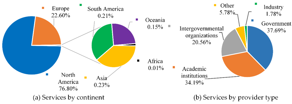 The regional distribution and types of monitored public WMS providers; (a) while most services are in North America and Europe, among the remaining 0.6%, Asia contains 0.23%; (b) providers by sector; government has the largest proportion (37.69%), followed by academic institutions (34.19%), while industry has the smallest proportion (1.78%).