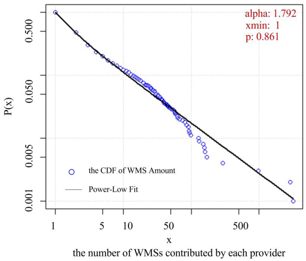 Log-log plot of the Cumulative Density Functions (CDF) p(x) for the number of WMSs contributed by each provider according to a discrete power law with and .